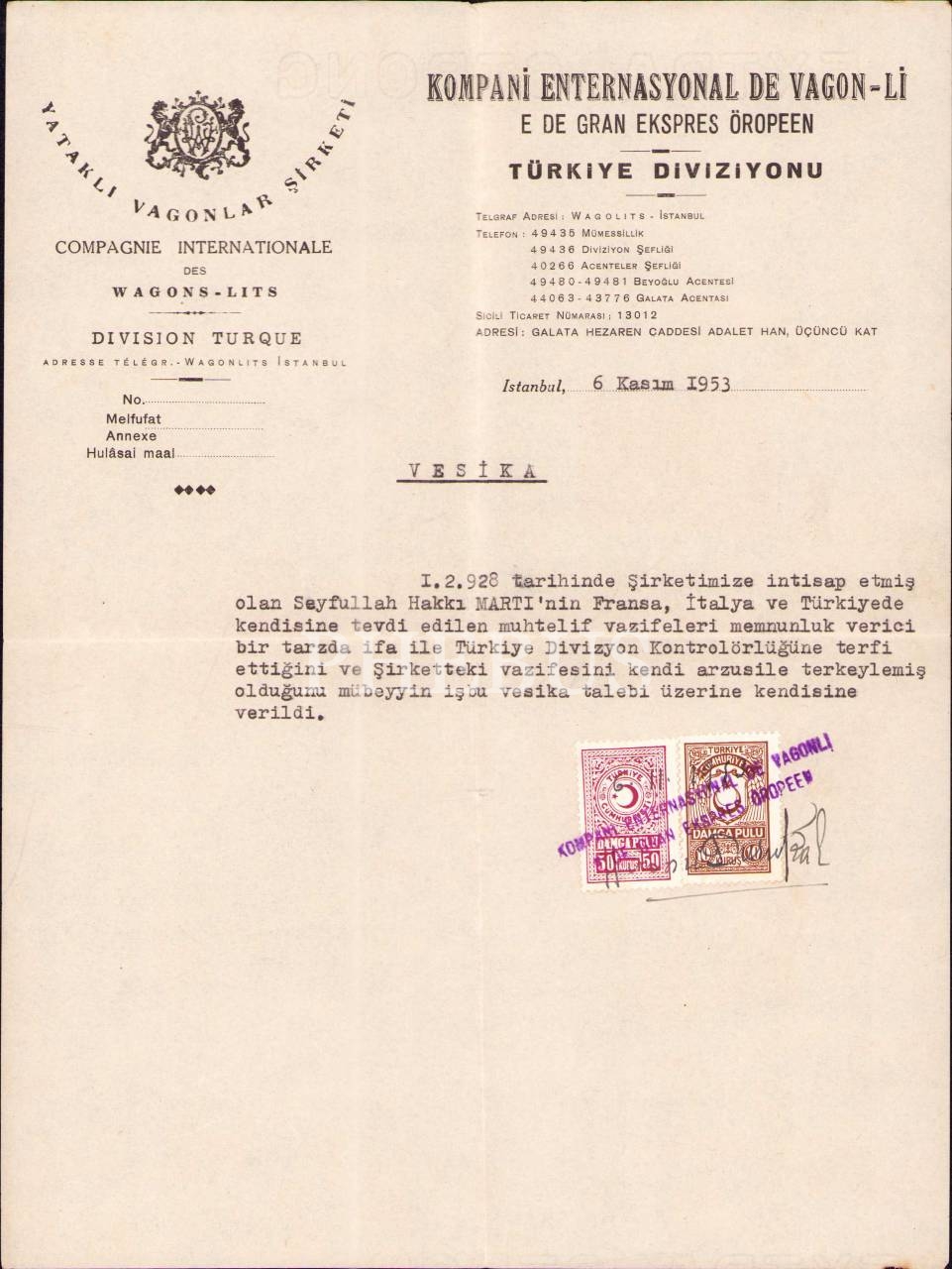 Kompani Enternasyonal De Vagon-Li (Yataklı Vagonlar Şirketi) antetli terfi belgesi, İstanbul 1953, 21x28 cm