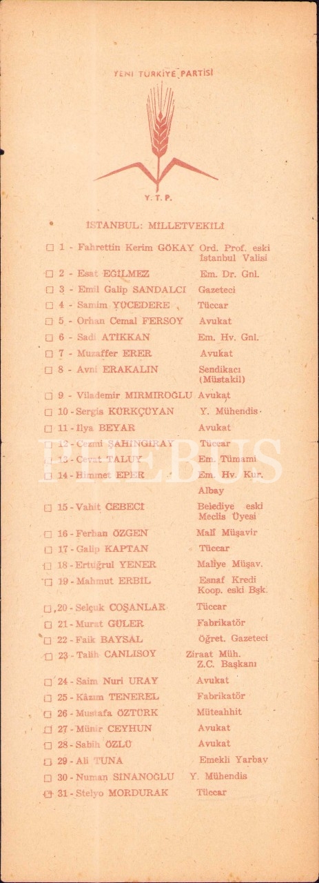 Siyaset tarihi: Yeni Türkiye Partisi İstanbul milletvekili adayları listesi, 12x33 cm