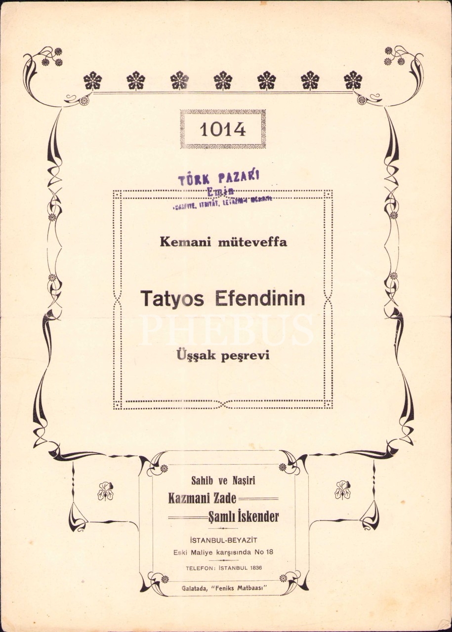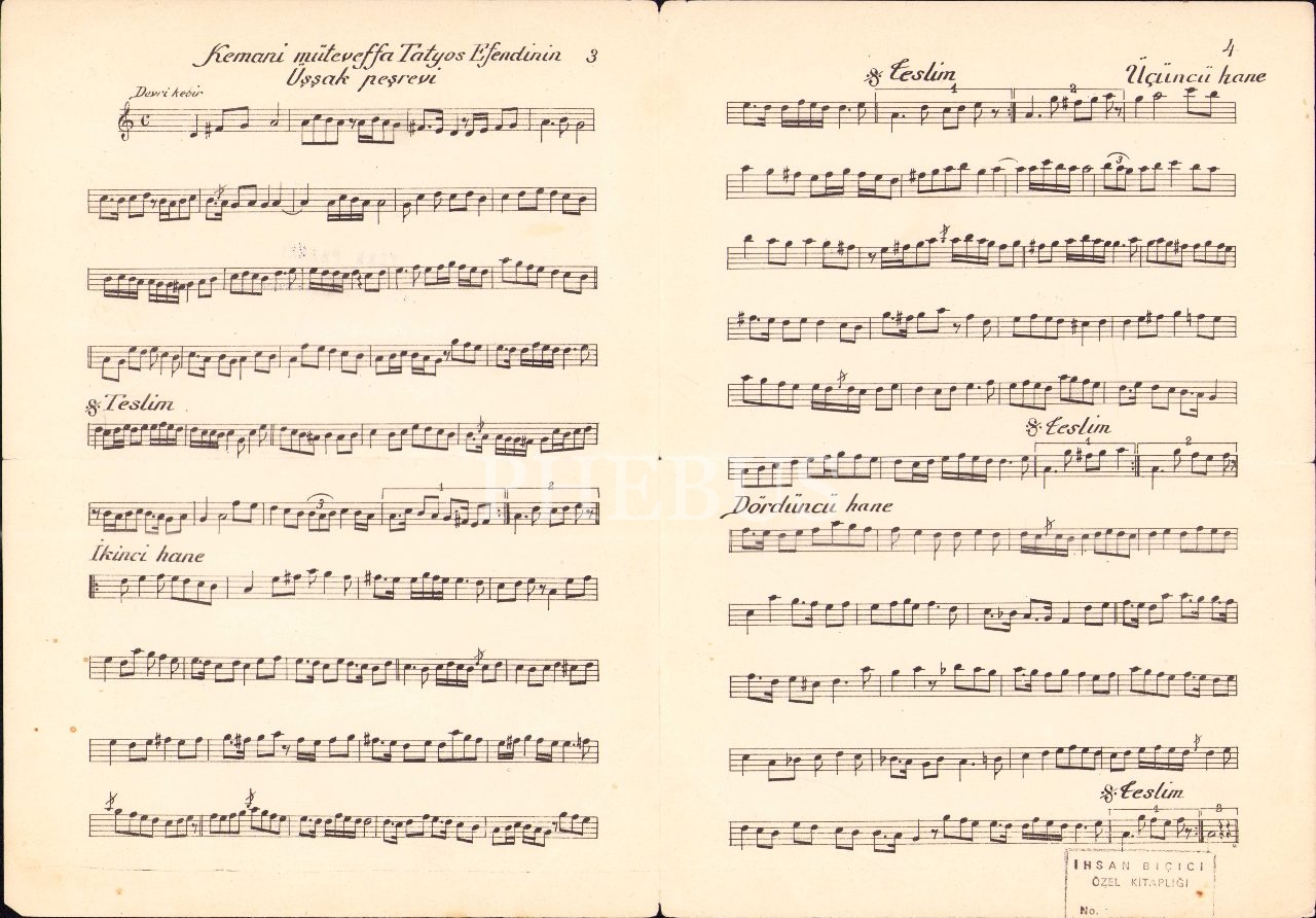 Müzik tarihi: Kemani Tatyos Efendi´nin Uşşak peşrevi, Kazmani Zade Şamlı İskender yayını, İstanbul, 20x28 cm