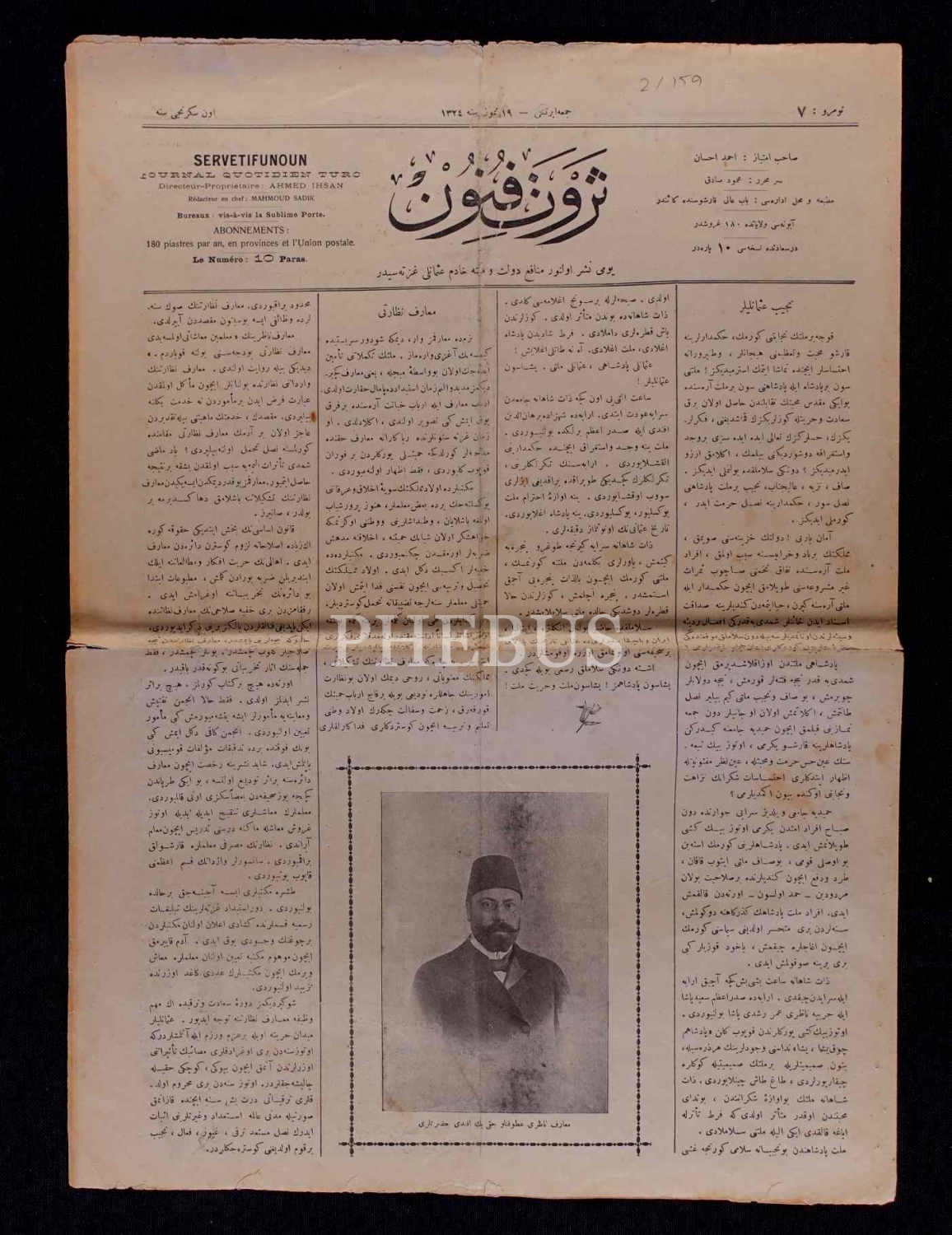 "Devlet ve milletin menfaatine hizmet eden Osmanlı gazetesi" Servet-i Fünun´un 7. sayısı, Maarif Nazırı Hakkı Bey´e ait kapak görseliyle, 34x48 cm