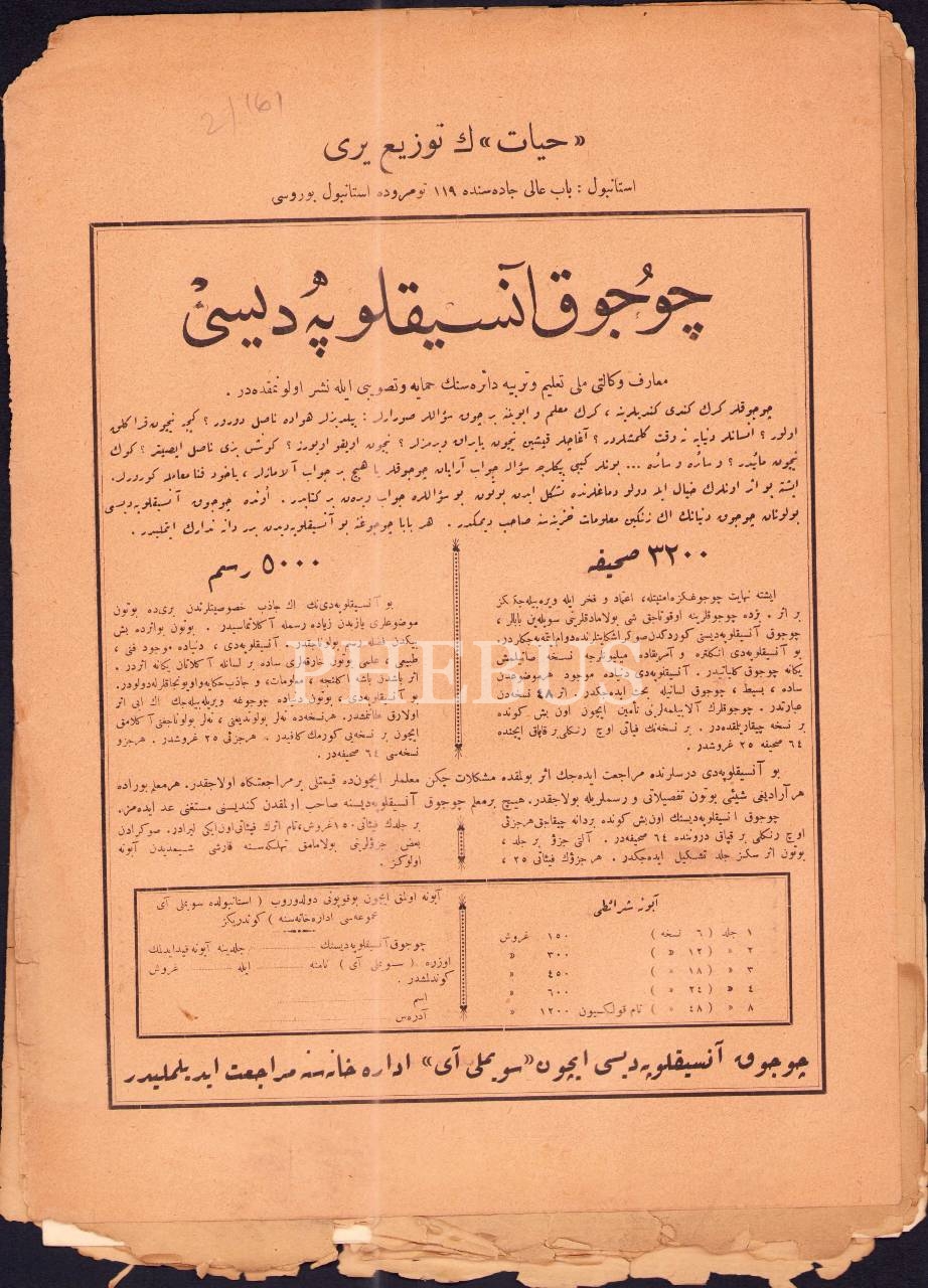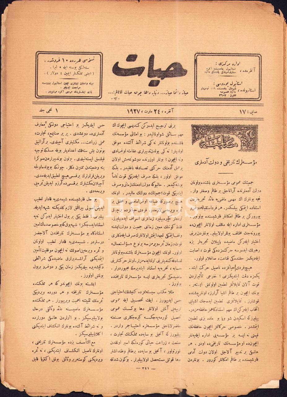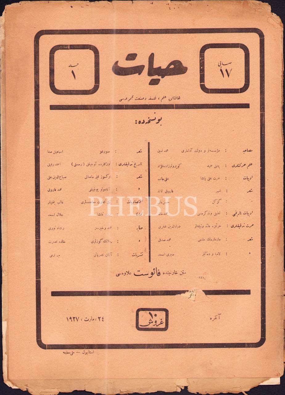 İlim, felsefe ve sanat mecmuası Hayat´ın 17. sayısı, 24 Mart 1927, 25x34 cm, kapak sırtı yıpranmış haliyle