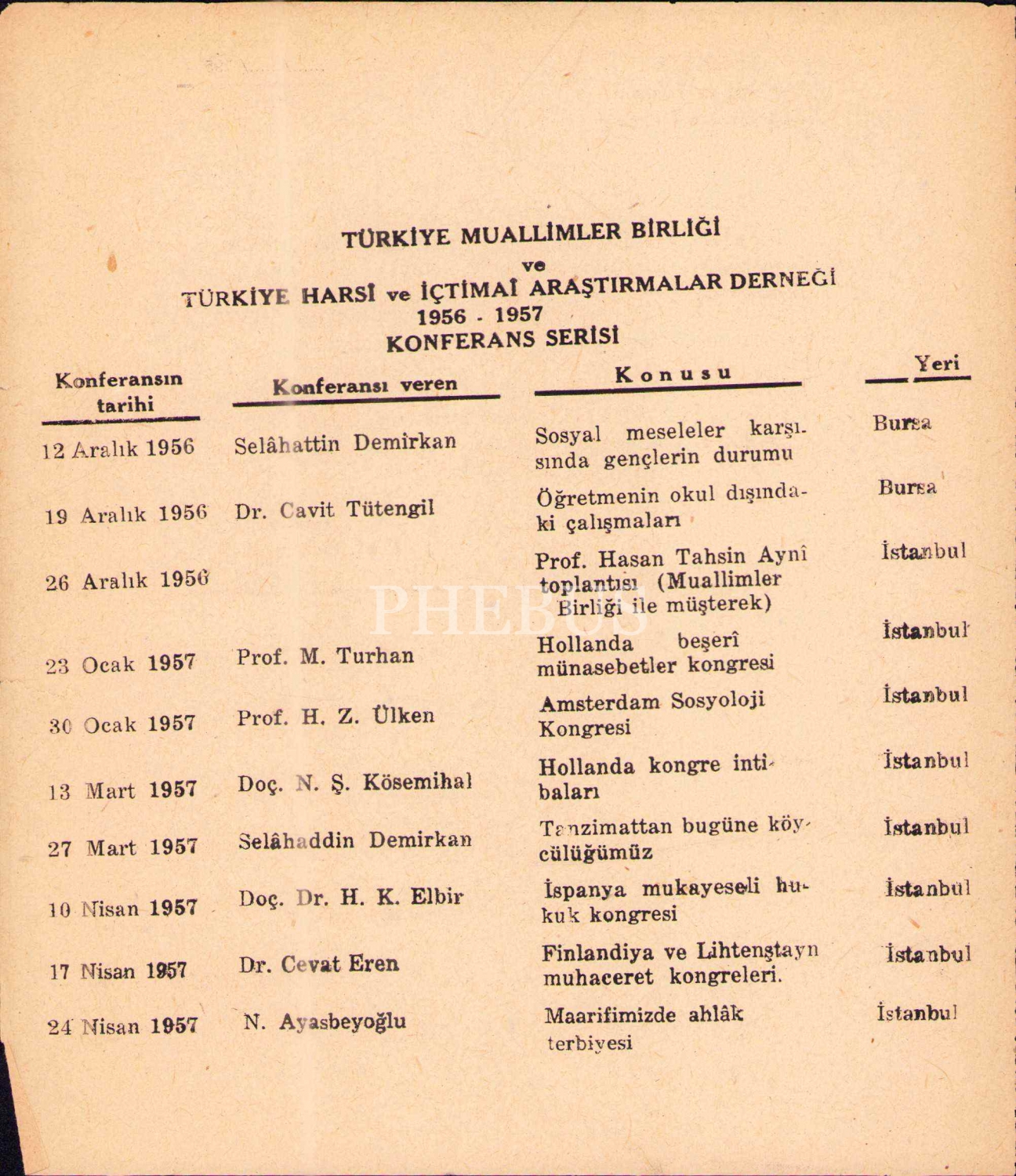 Türkiye Muallimler Birliği ve Türkiye Harsî ve İçtimaî Araş. Dern. 1956-57 dönemi konferans programı, 17x19 cm