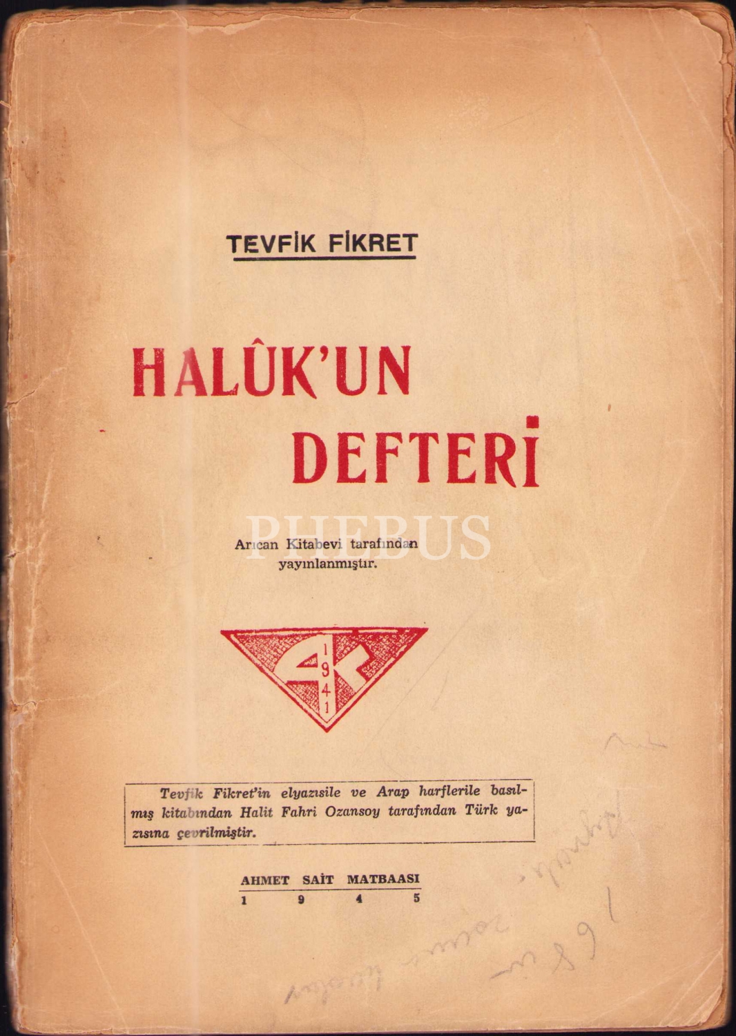 "Tevfik Fikret´in elyazısile ve Arap harflerile basılmış kitabından Halit Fahri Ozansoy tarafından Türk yazısına çevrilmiştir."