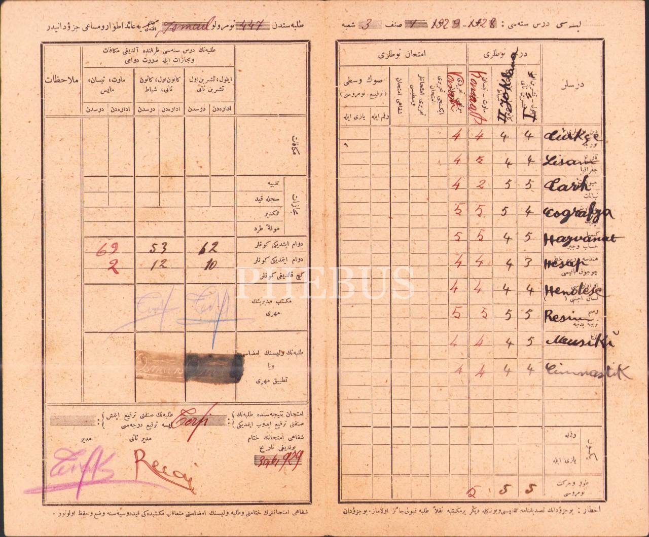 Eğitim tarihi: Kadıköy Lisesi 1928-29 ders yılı karnesi, 20x25 cm