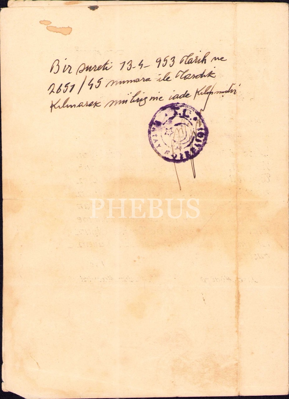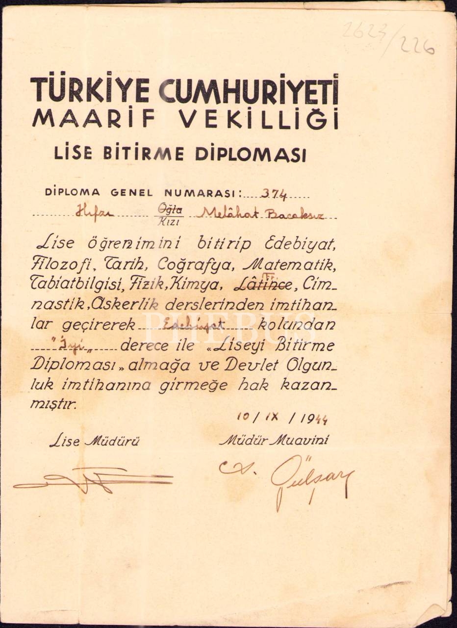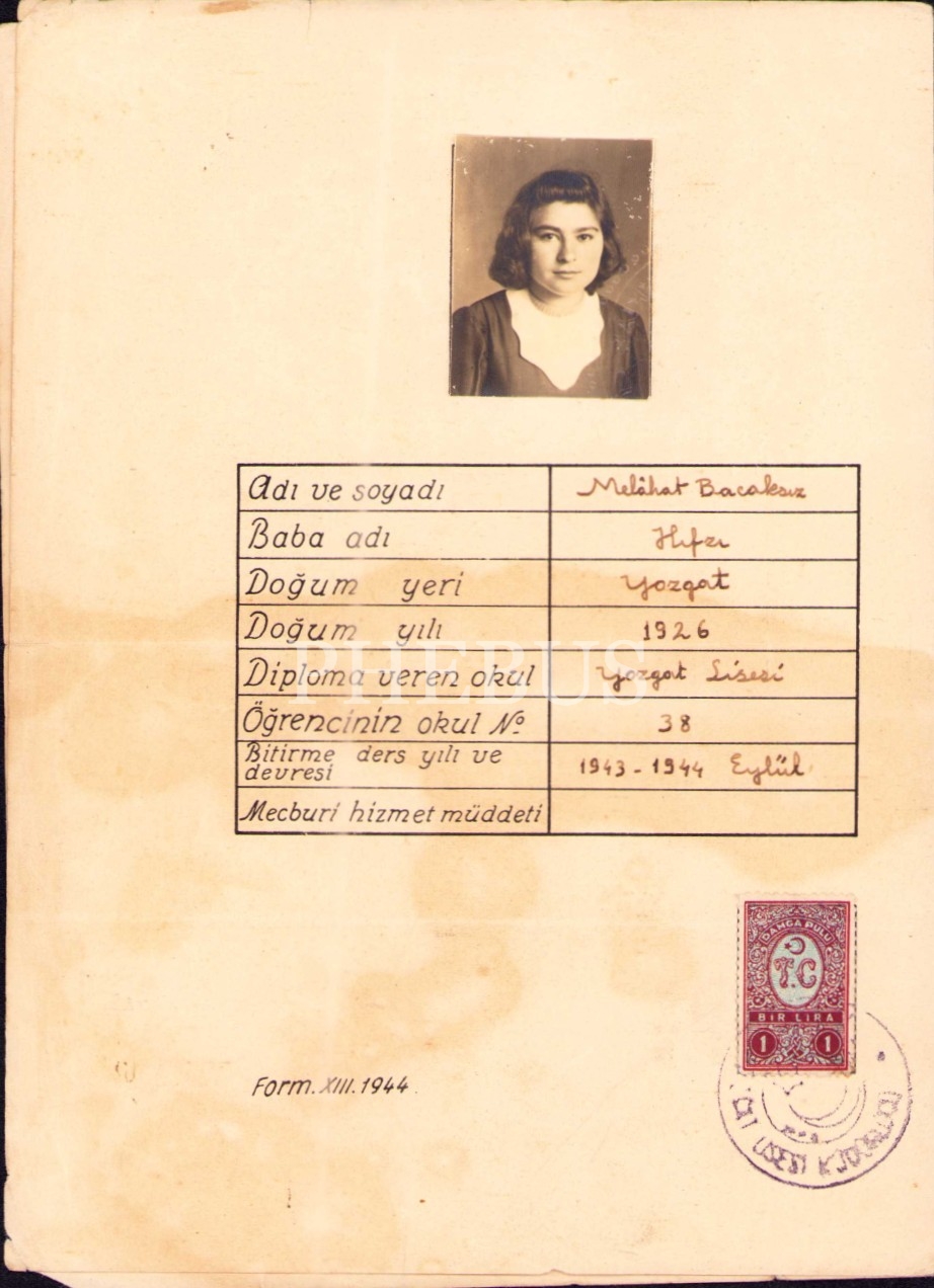 Eğitim tarihi: fotoğraflı lise diploması, Yozgat 1944, 23x33 cm, kenarlarında hafif yırtık mevcut haliyle