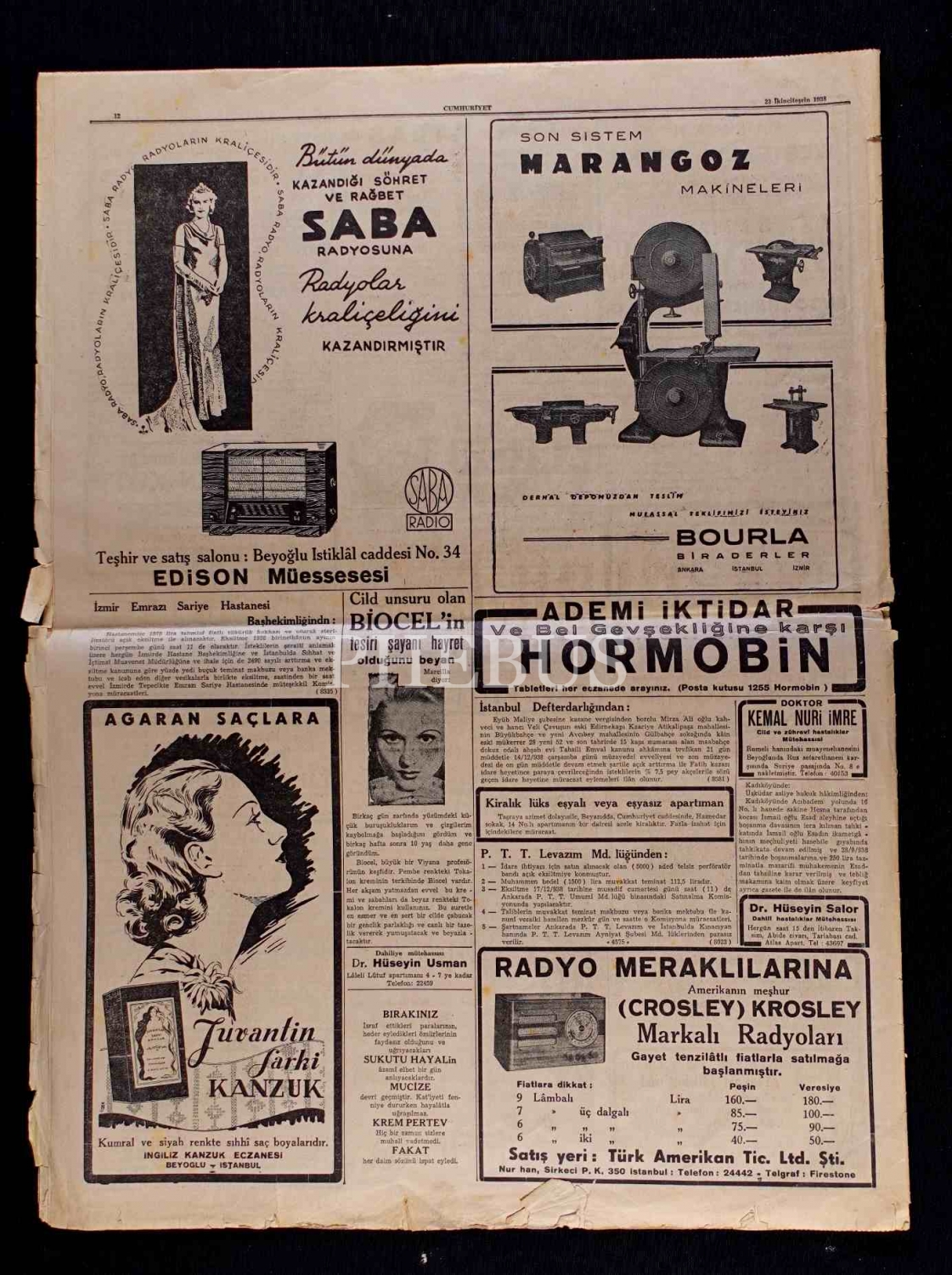 Cumhuriyet gazetesinin Atatürk´´ün cenazesine dair görsel ve manşet haberleriyle 23 İkinciteşrin 1938 tarihli sayısı, 45x62 cm, hafif yıpranmış haliyle