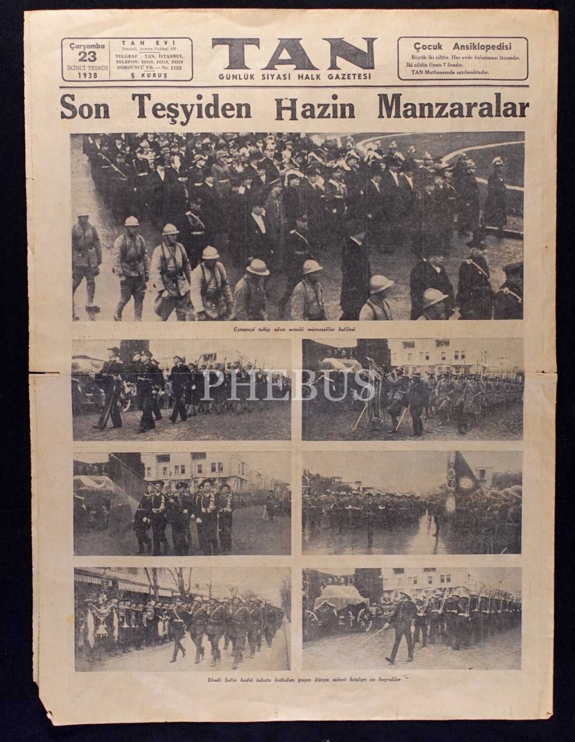 Tan gazetesinin Atatürk´ün cenazesine dair görsel ve haberleriyle 23 İkinciteşrin 1938 tarihli sayısı, 43x59 cm, kenarlarında yırtık mevcut haliyle