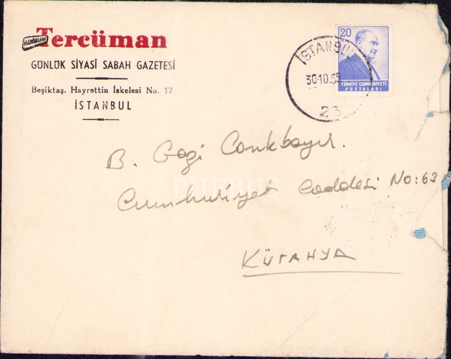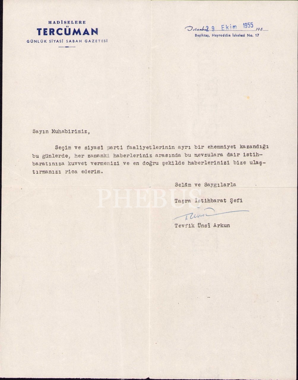 Tercüman Gazetesi İstihbarat Şefi Tevfik Ünsi Arkun´un Kütahya´da bulunan bir muhabire yazdığı 29 Ekim 1955 tarihli ıslak imzalı mektup ve zarfı, 24x30 cm
