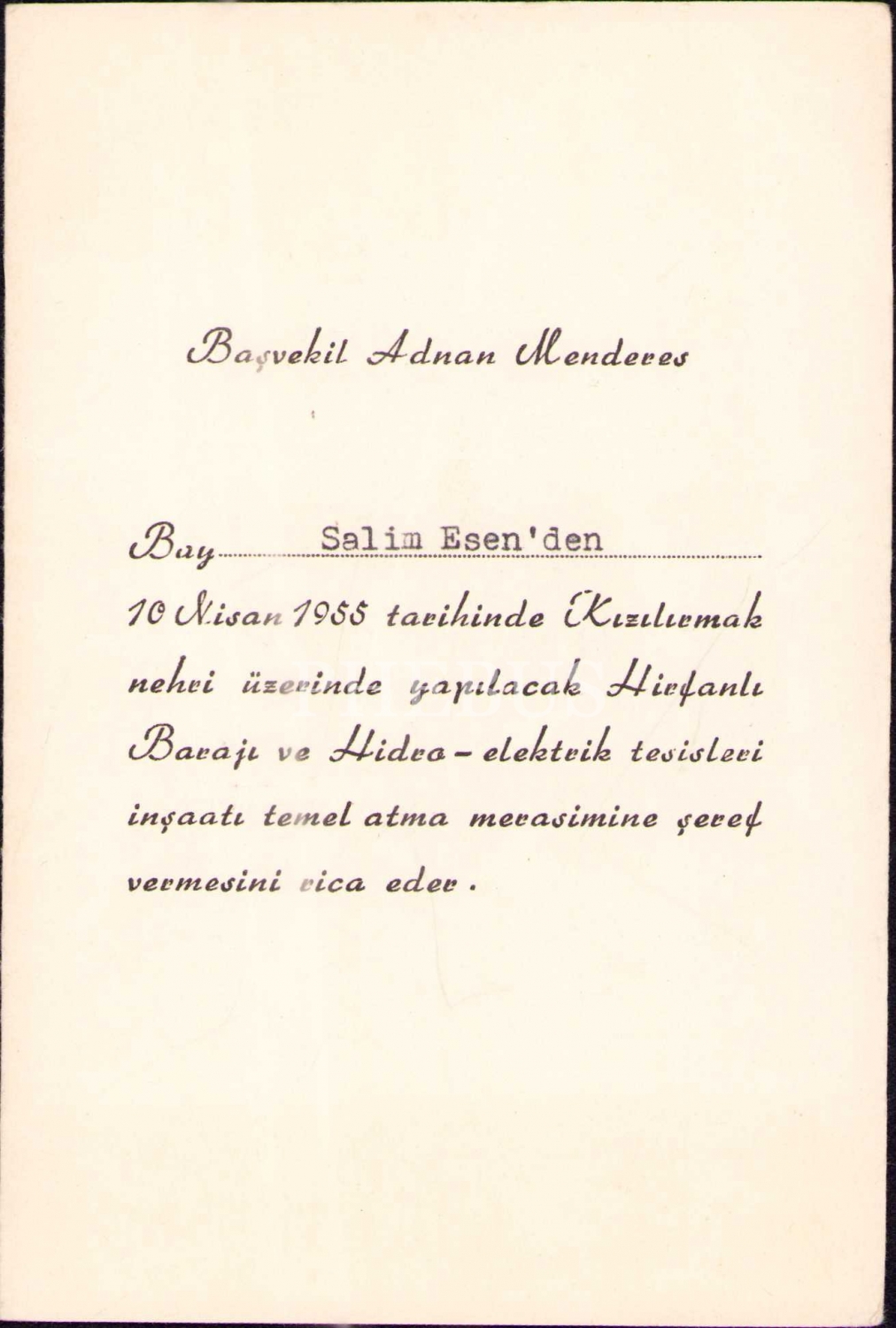 Başvekil Adnan Menderes adına Salim Esen´e gönderilen Hirfanlı Barajı temel atma töreni davetiyesi, 11x16 cm