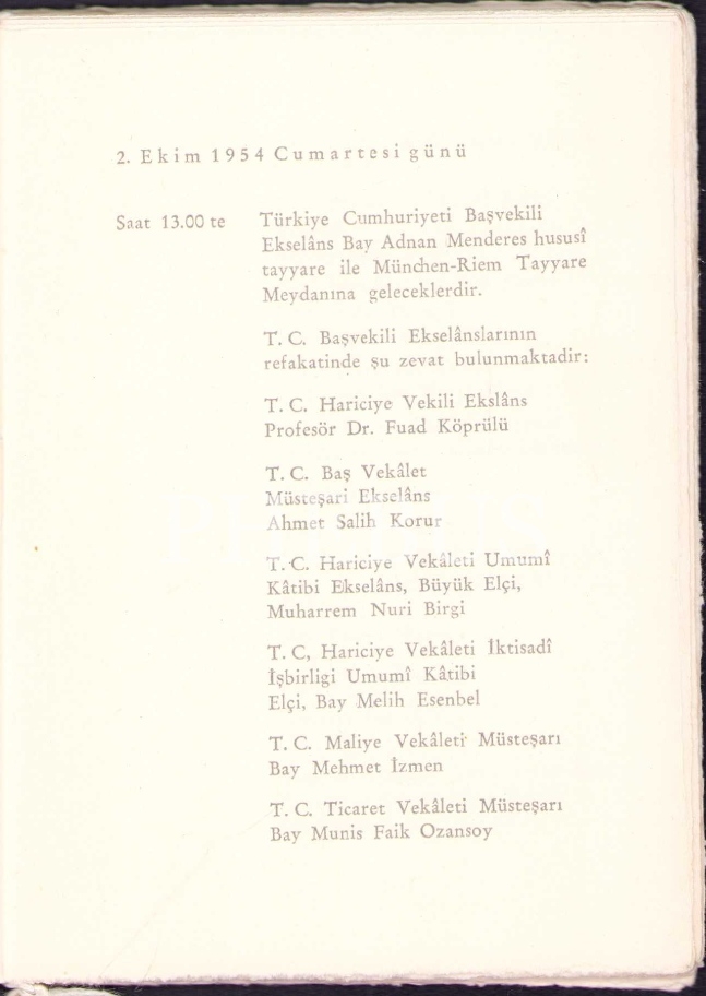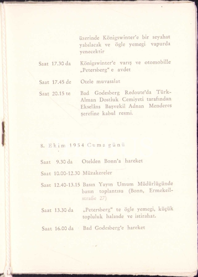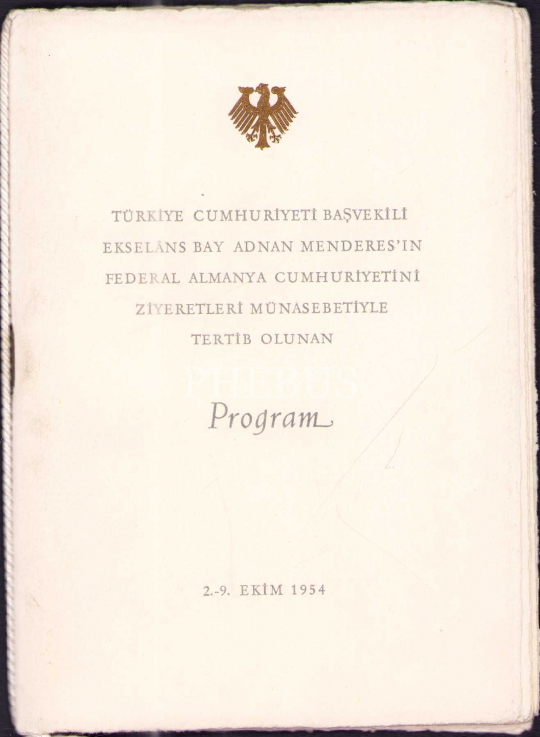 1954´de Adnan Menderes´in Almanya Cumhuriyetini ziyareti münasebetiyle düzenlenen Program, 20 sayfa, 10x15 cm