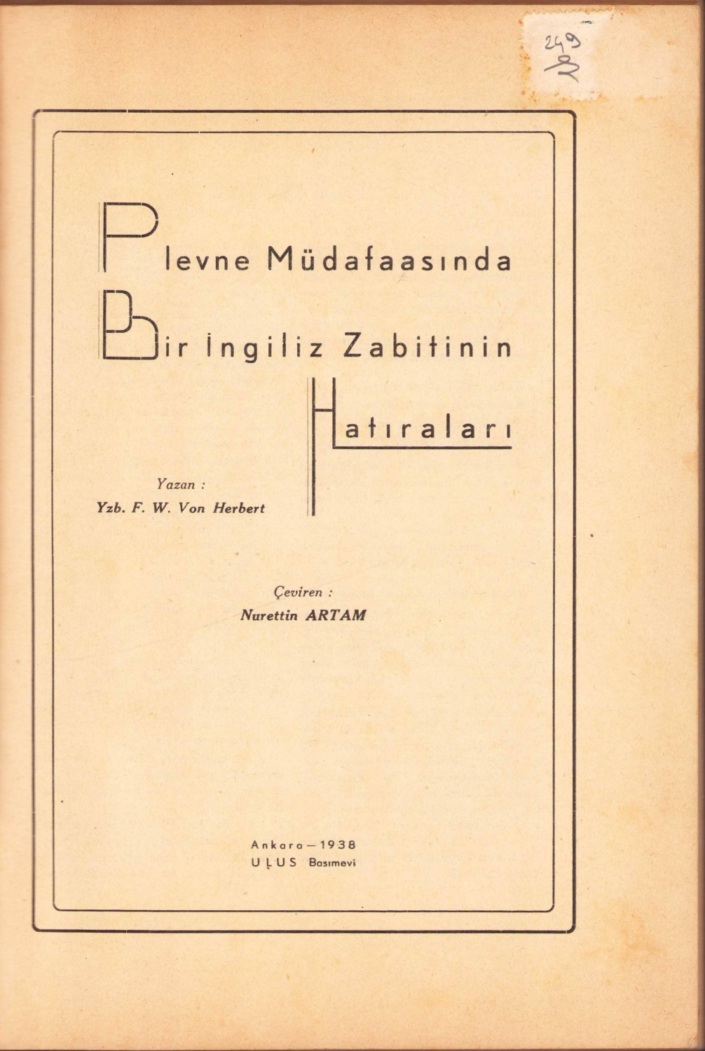 Plevne Müdafasında Bir İngiliz Zabitinin Hatıraları, F. W. Von Herbert, çev., Nurettin Artam, Ankara, 1938, 186 sayfa