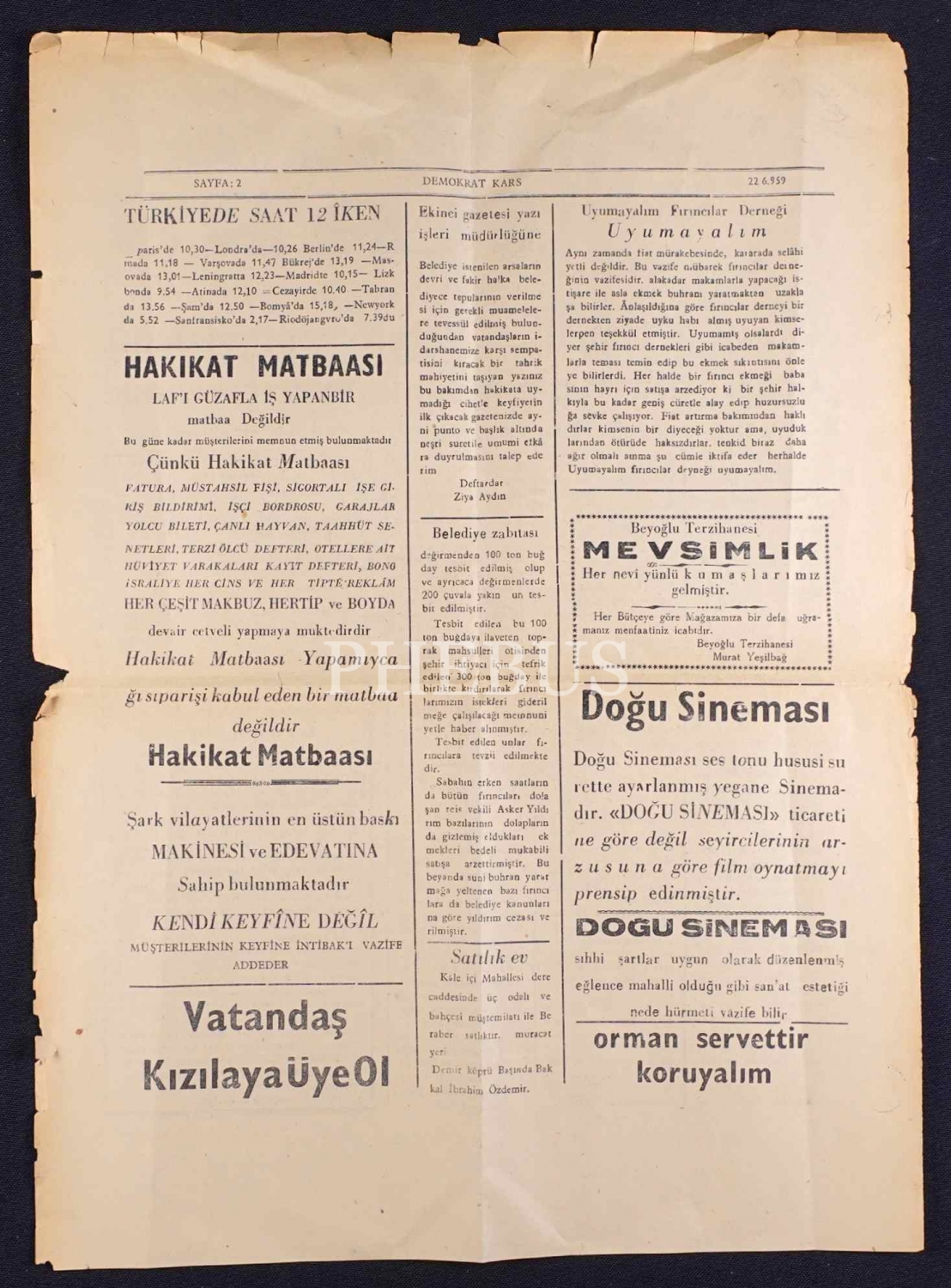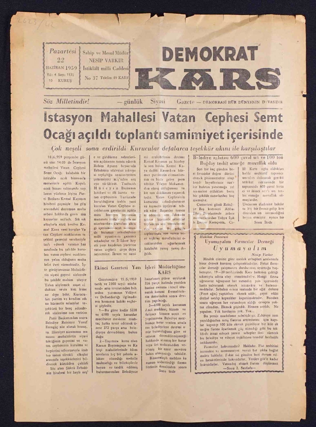 1959 tarihli Demokrat Kars Gazetesinin ilk sayfası, önlü arkalı, 35x52 cm