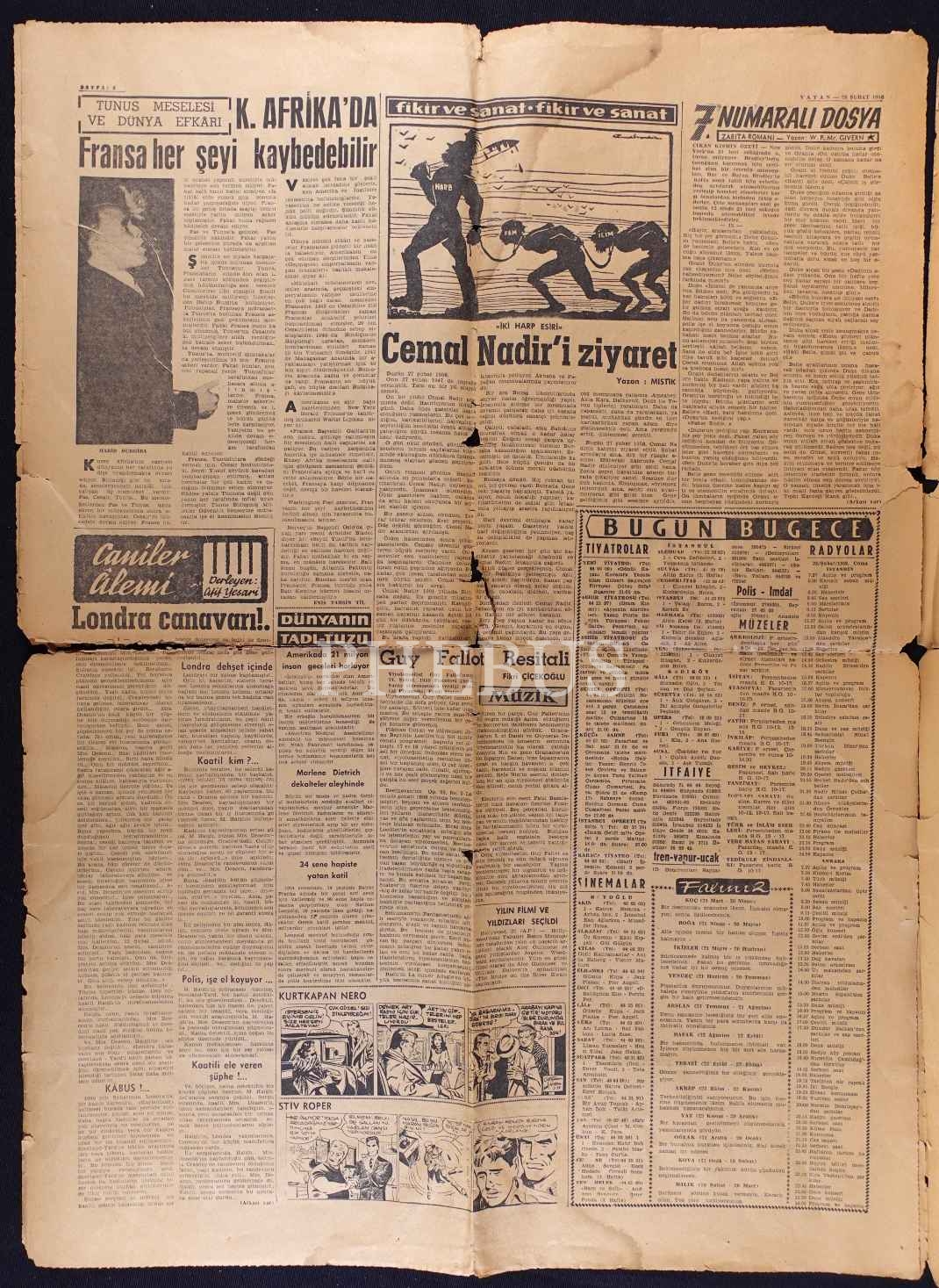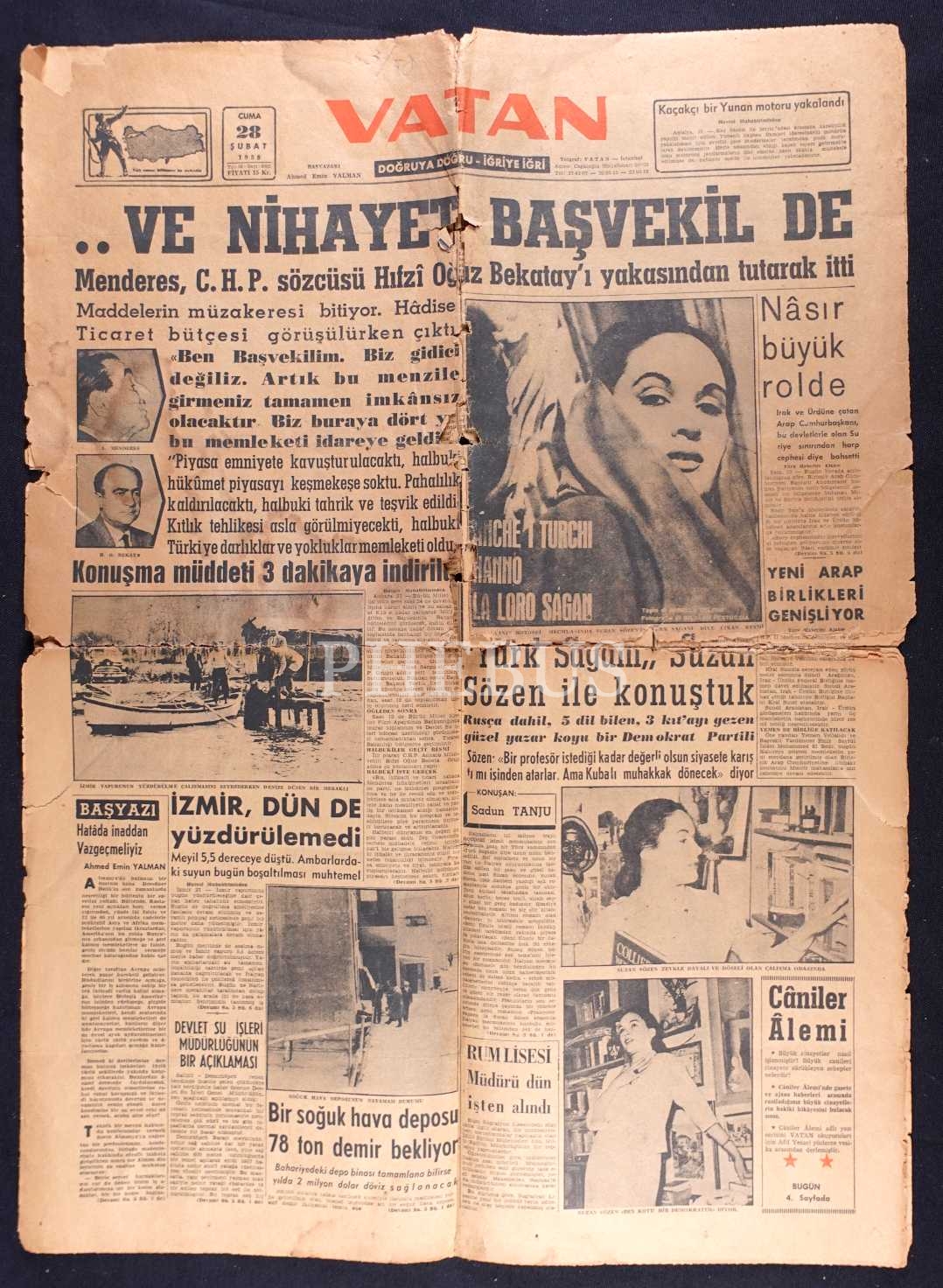 "Menderes CHP sözcüsü Hıfzı Oğuz Bekatay´ı yakasından Tutarak İtti" manşetli 1958 tarihli Vatan Gazetesi, 6 sayfa, 42x60 cm