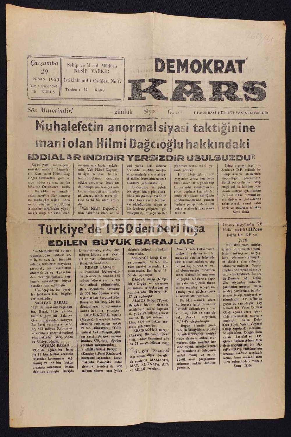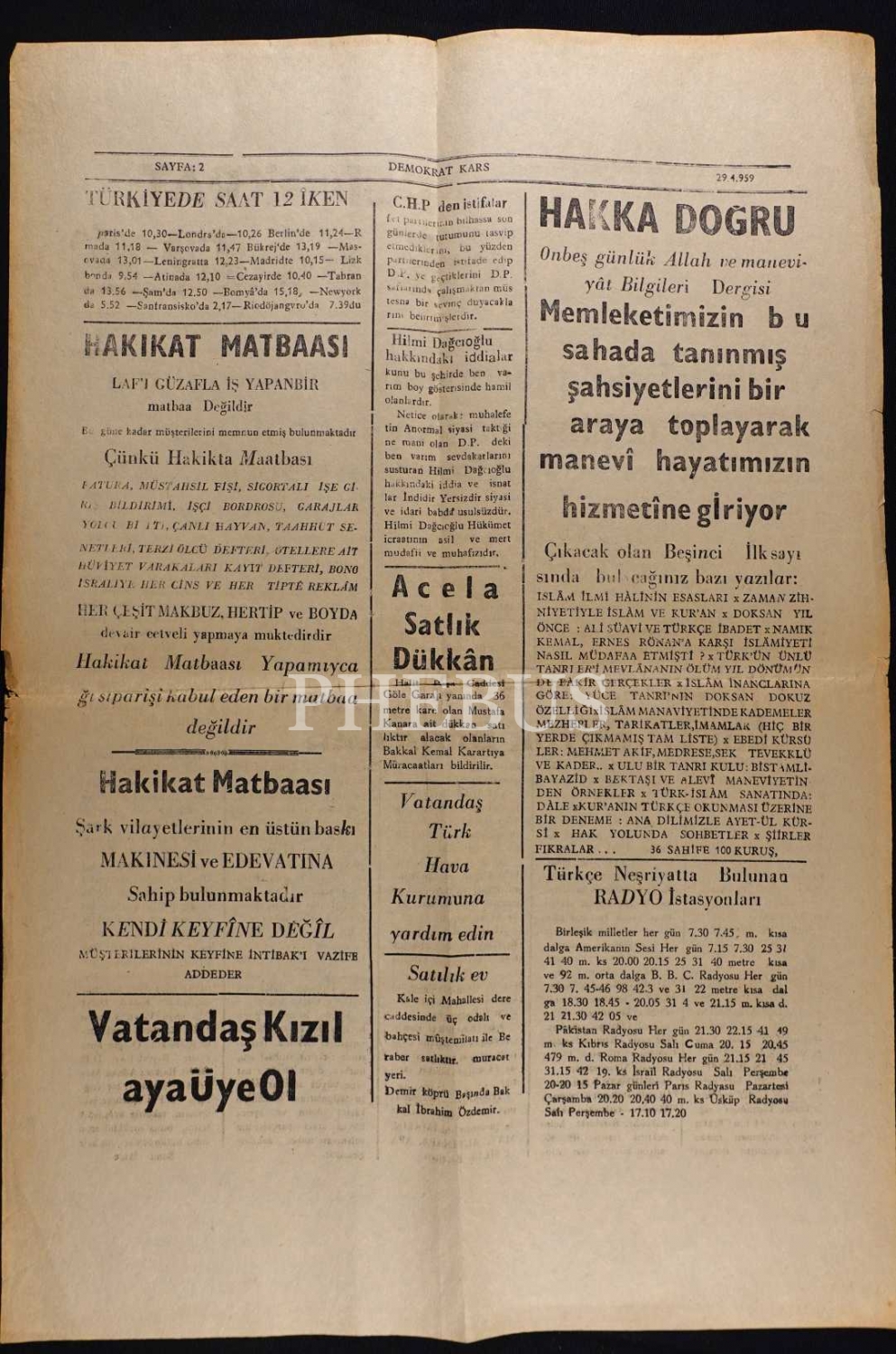 Demokrat Kars Gazetesi, 1959 tarihli, 2 sayfa, 34x50 cm