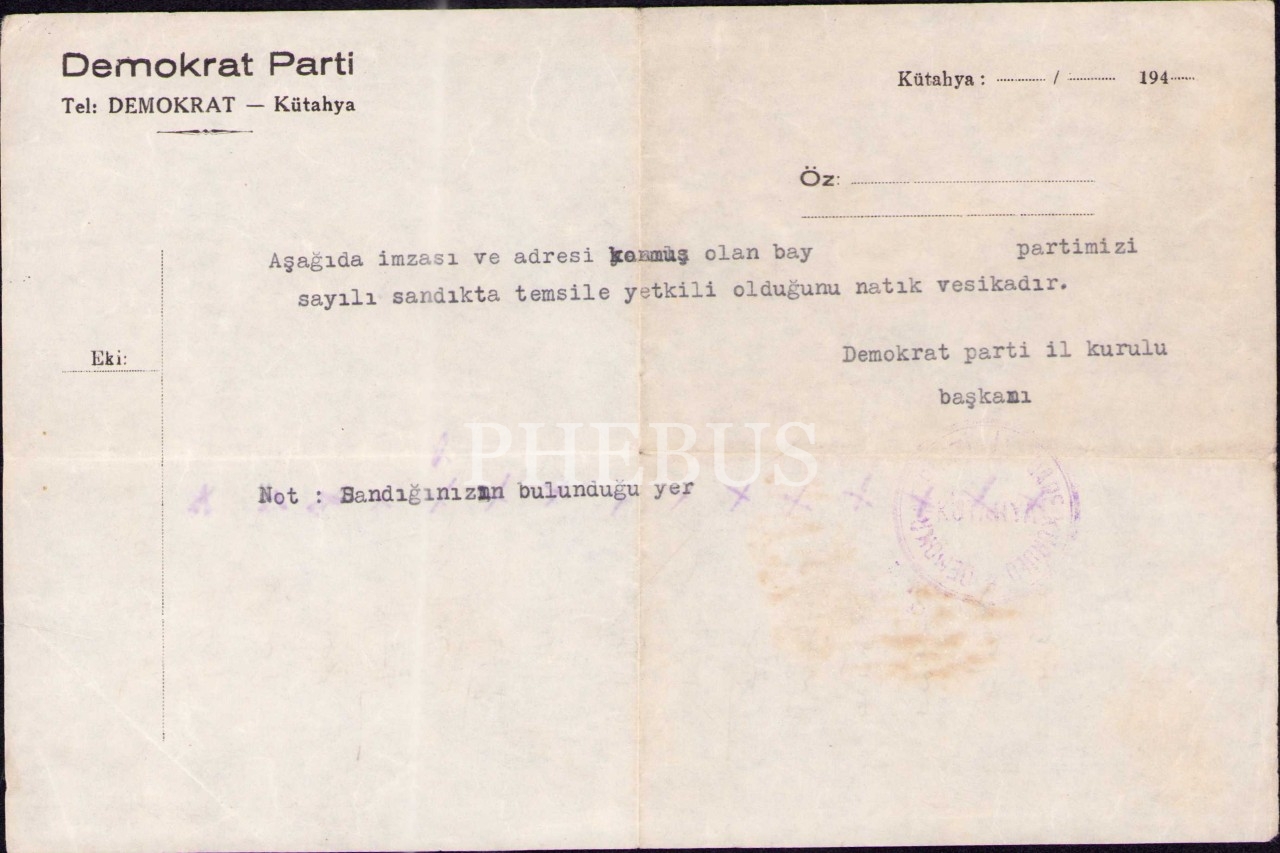Demokrat Parti Kütahya İl Kurulu Başkanı mühürlü boş vesika, 15x23 cm