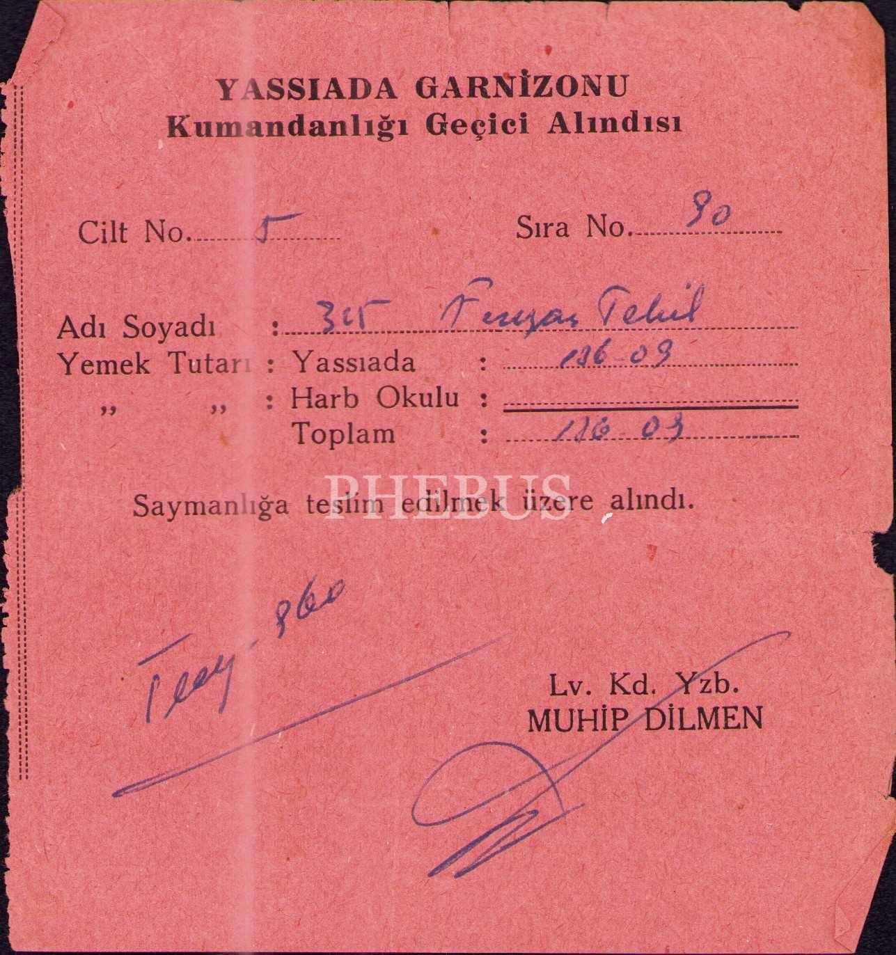 Yassıada Garnizonu Kumandanlığı Geçici Alındısı, Muhip Dilmen imzalı, 11x12 cm