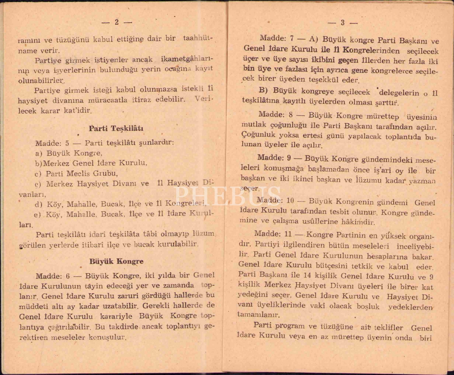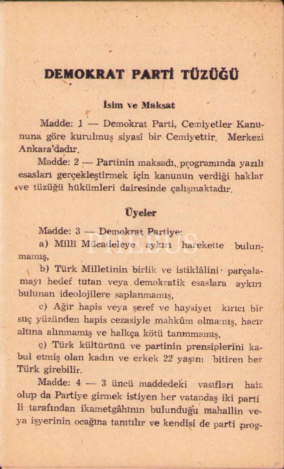 Demokrat Parti tüzüğü, 1947 tarihli, Sakarya Basımevi, 16 sayfa, 11x17 cm