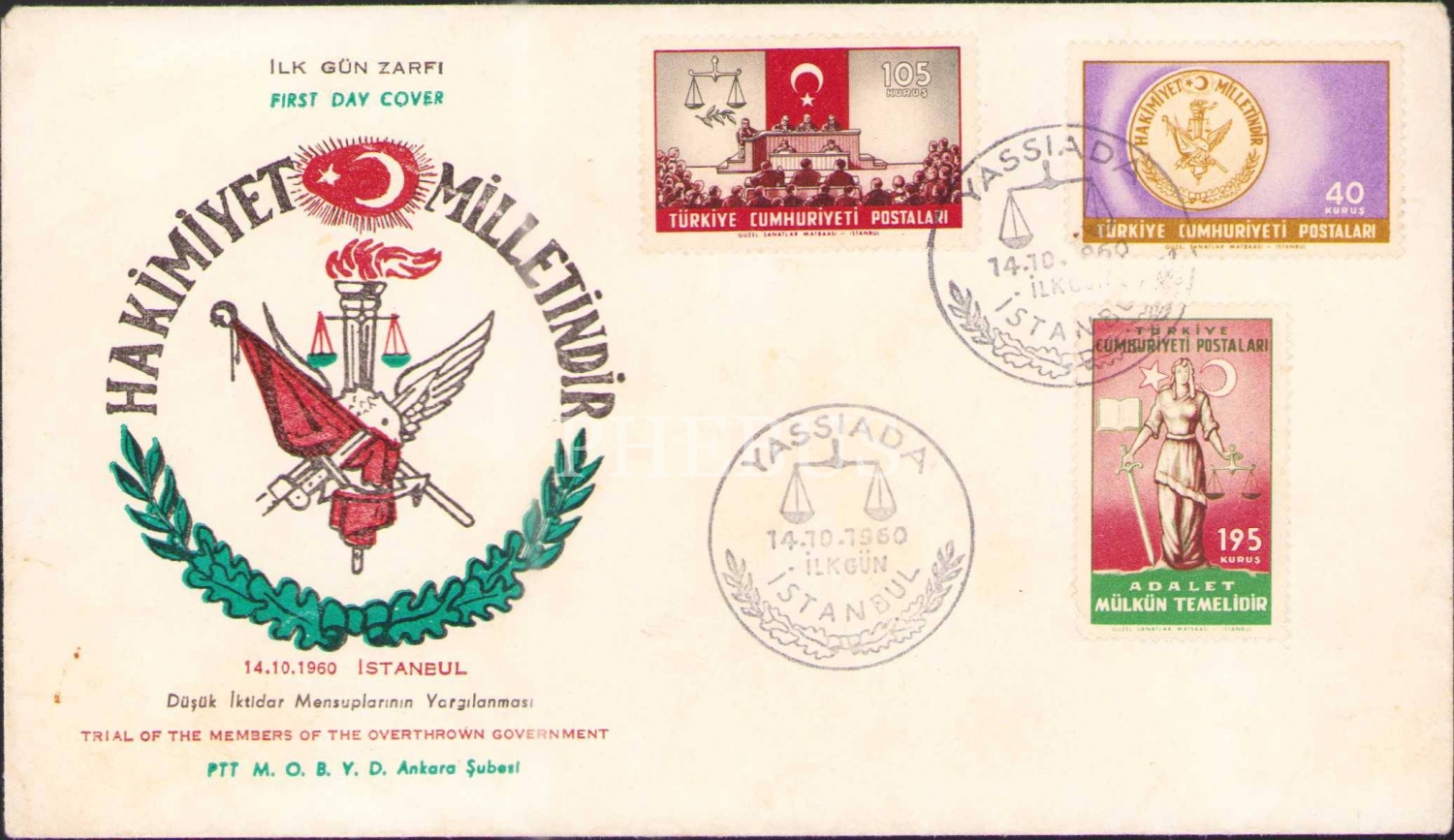 "Yassıada, 14.10.1960 - İstanbul mühürlü" ilk gün zarfı, 10x17 cm