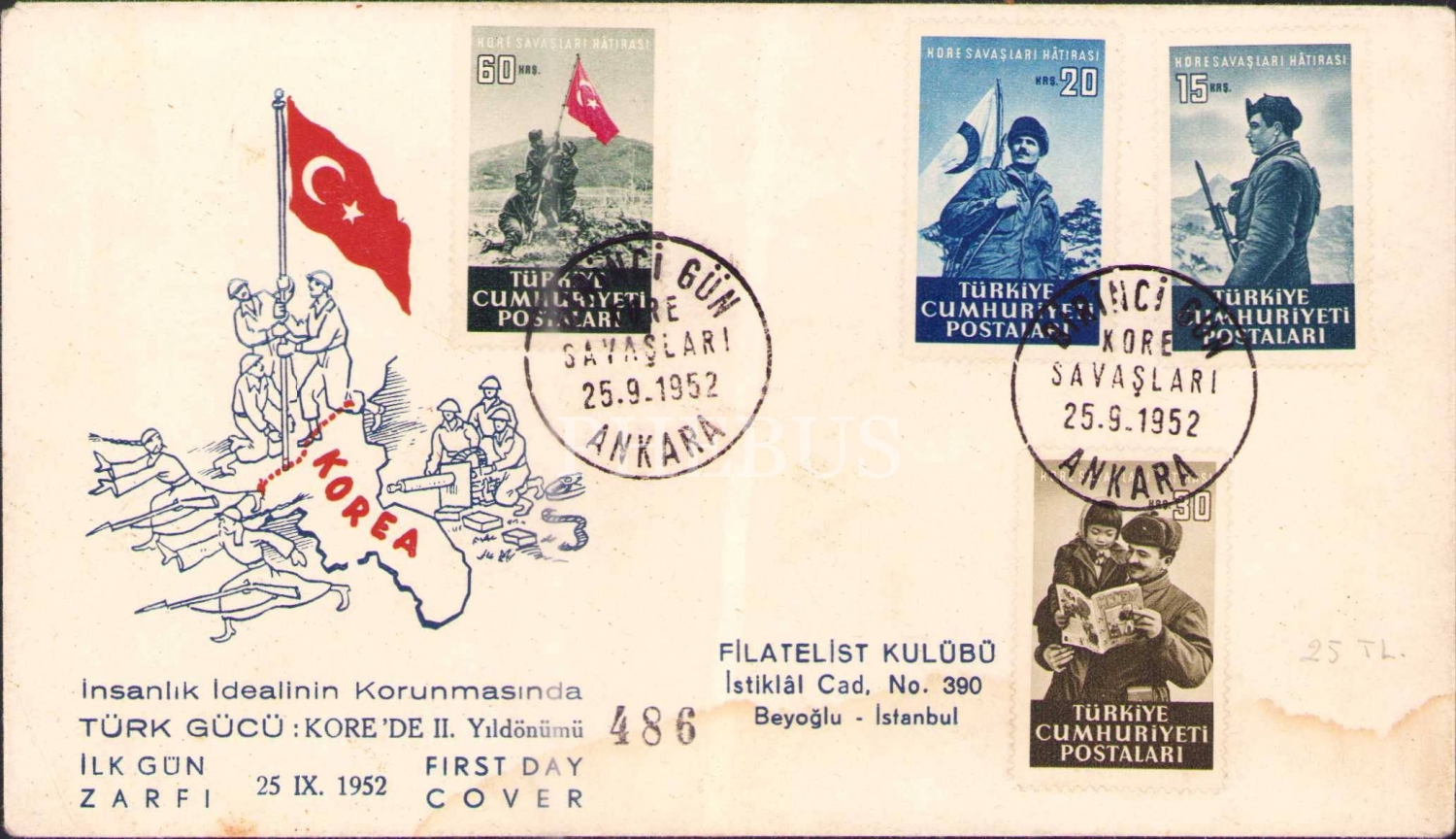 "Birinci Gün, Kore Savaşları, 25.09.1952 - Ankara" mühürlü zarf, 10x17 cm