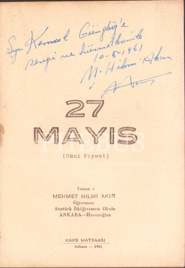 27 Mayıs okul piyesi, yazarı M. Hilmi Akın´dan Kemal Güngör´e imzalı, 1961 tarihli, 24 sayfa, 14x20 cm