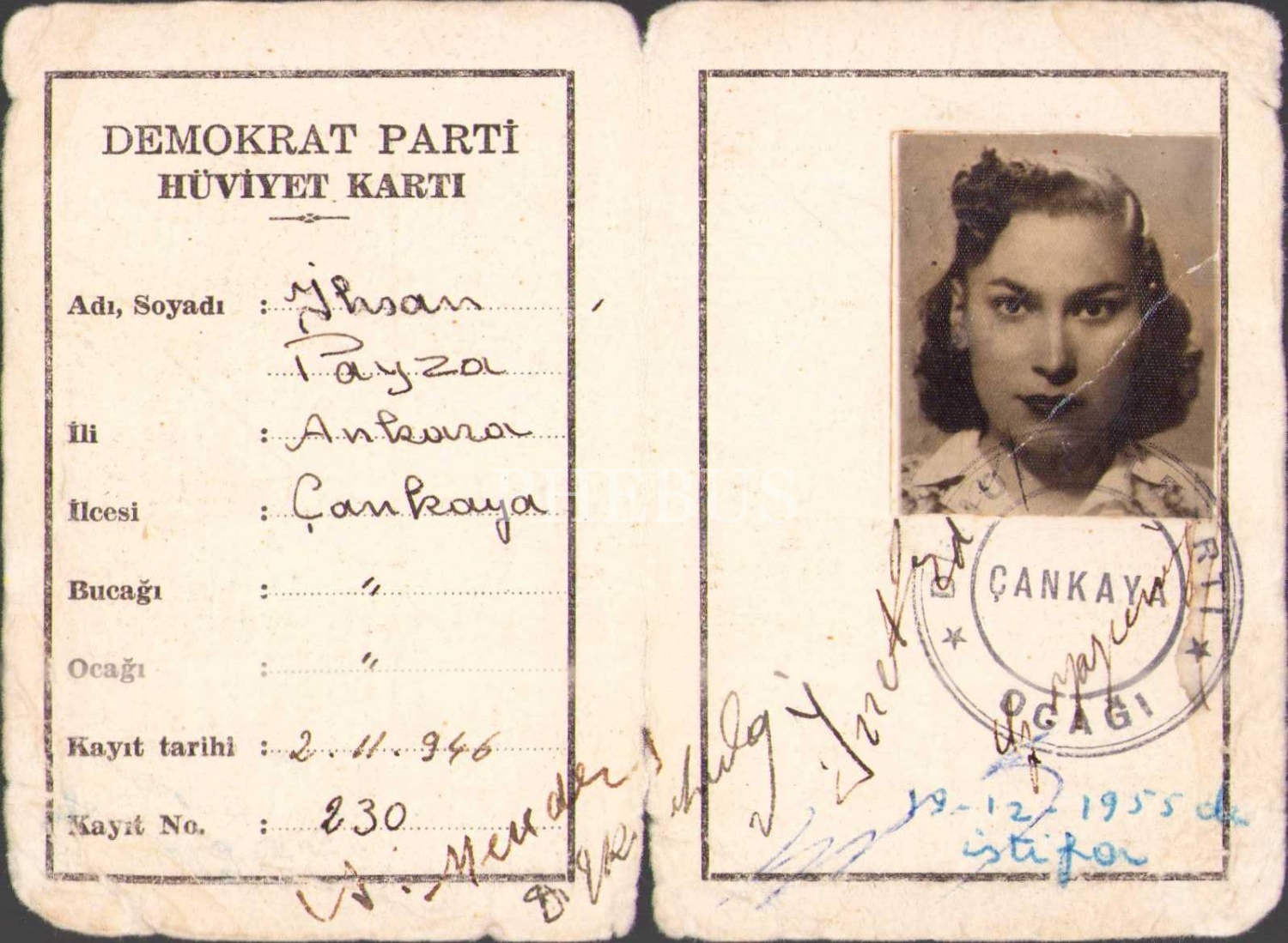 Demokrat Parti hüviyet kartı, İhsan Payzol, Başvekil Adnan Menderes ve partinin önde gelenlerinden ıslak imzalı, Ankara, 10x14 cm
