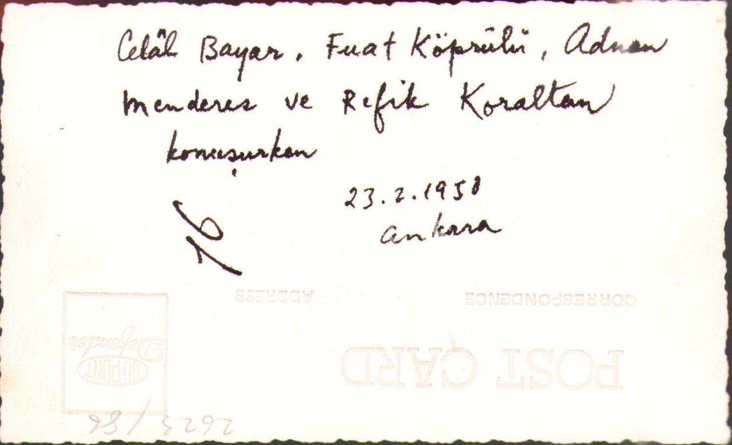 Celal Bayar, Adnan Menderes, Fuat Köprülü ve Refik Koraltan, Başvekilin bulunduğu aile evi, 23.02.1958 tarihli, Ankara, 7x12 cm