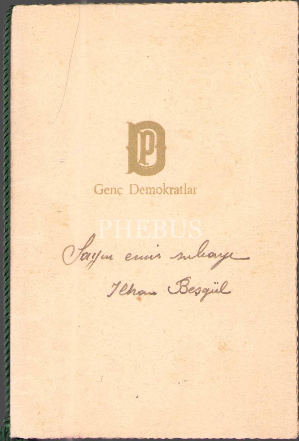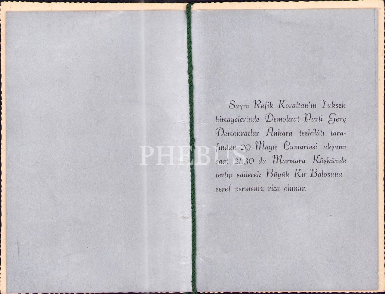 "Sayın Emir Subayı İlhan Beşgül" e gönderilen Genç Demokratlar Ankara teşkilatının düzenlediği balo davetiyesi, Ankara Valiliği Hukuk İşleri mühürlü, 16x21 cm