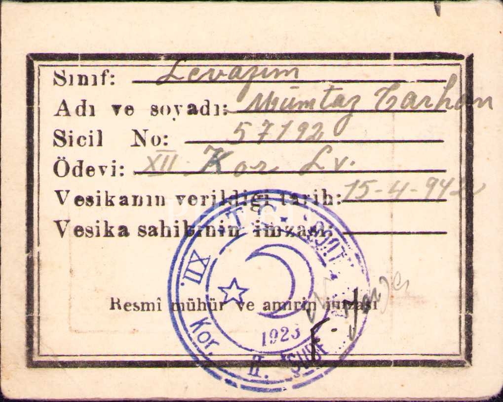 Mümtaz Tarhan´a ait askeri vesika, 9x14 cm
