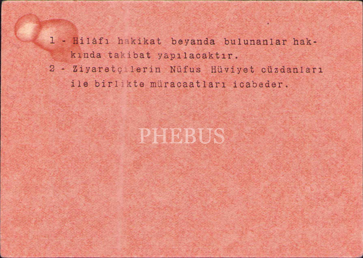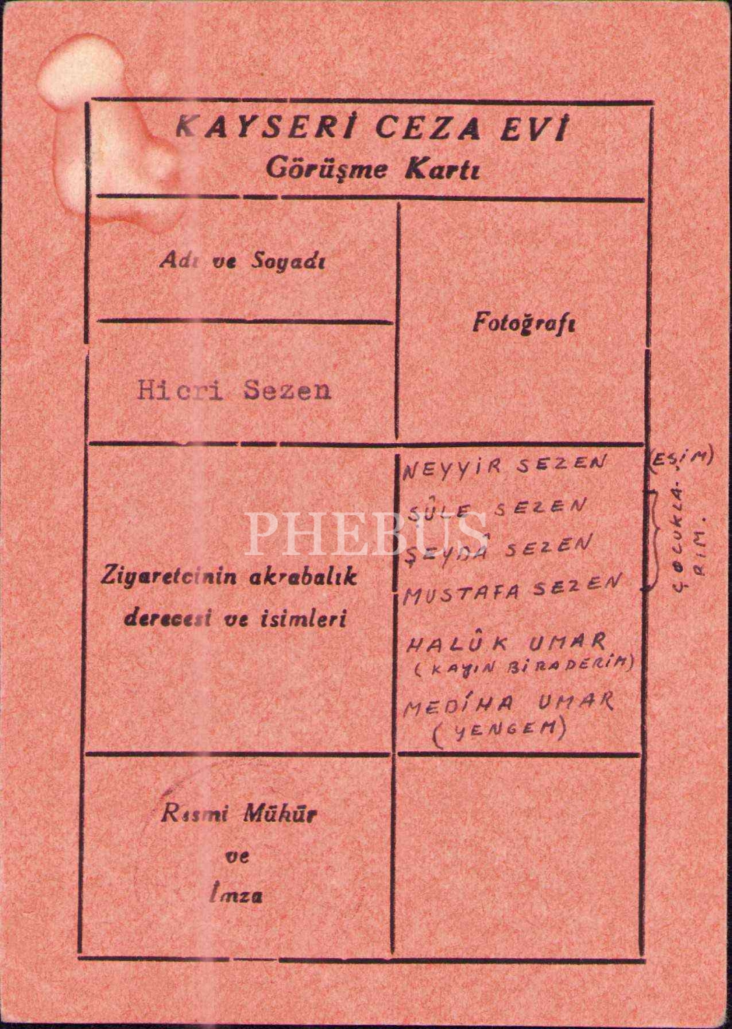 11. Dönem Eskişehir milletvekili Hicri Sezen´in Kayseri Ceza Evi görüşme kartı, 11x15 cm