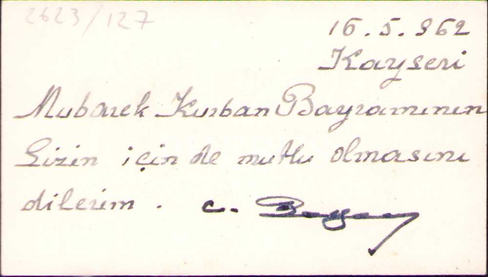 Celal Bayar´ın el yazısı ile bayram tebriği yazdığı ve imzaladığı kartviziti, 5x9 cm