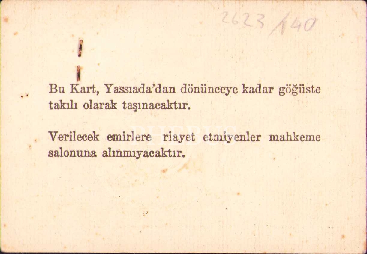 Yassıada vazifeli giriş kartı, Zülfükar Özbay, 7x10 cm