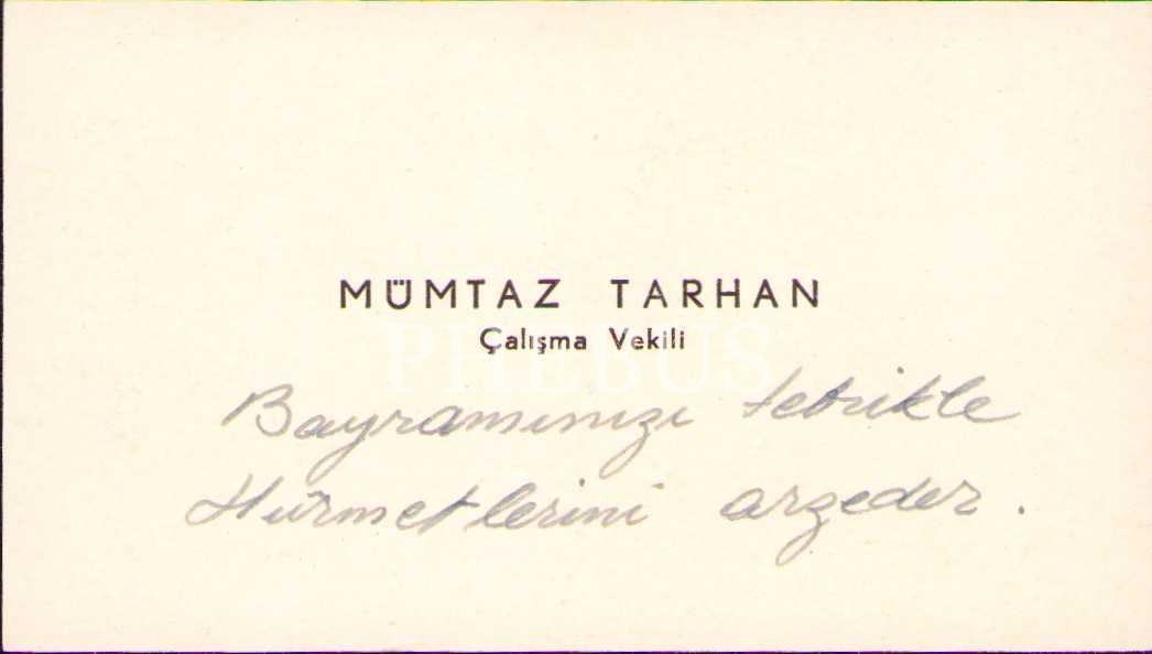Çalışma Vekili Mümtaz Tarhan, kartvizit üzerinde el yazısı ile bayram tebriği, 5x9 cm