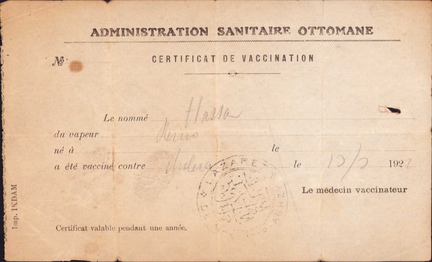 1921 aşı vesikası, Administration Saintaire Ottomane, Fransızca, arkası Osmanlıca yazılı