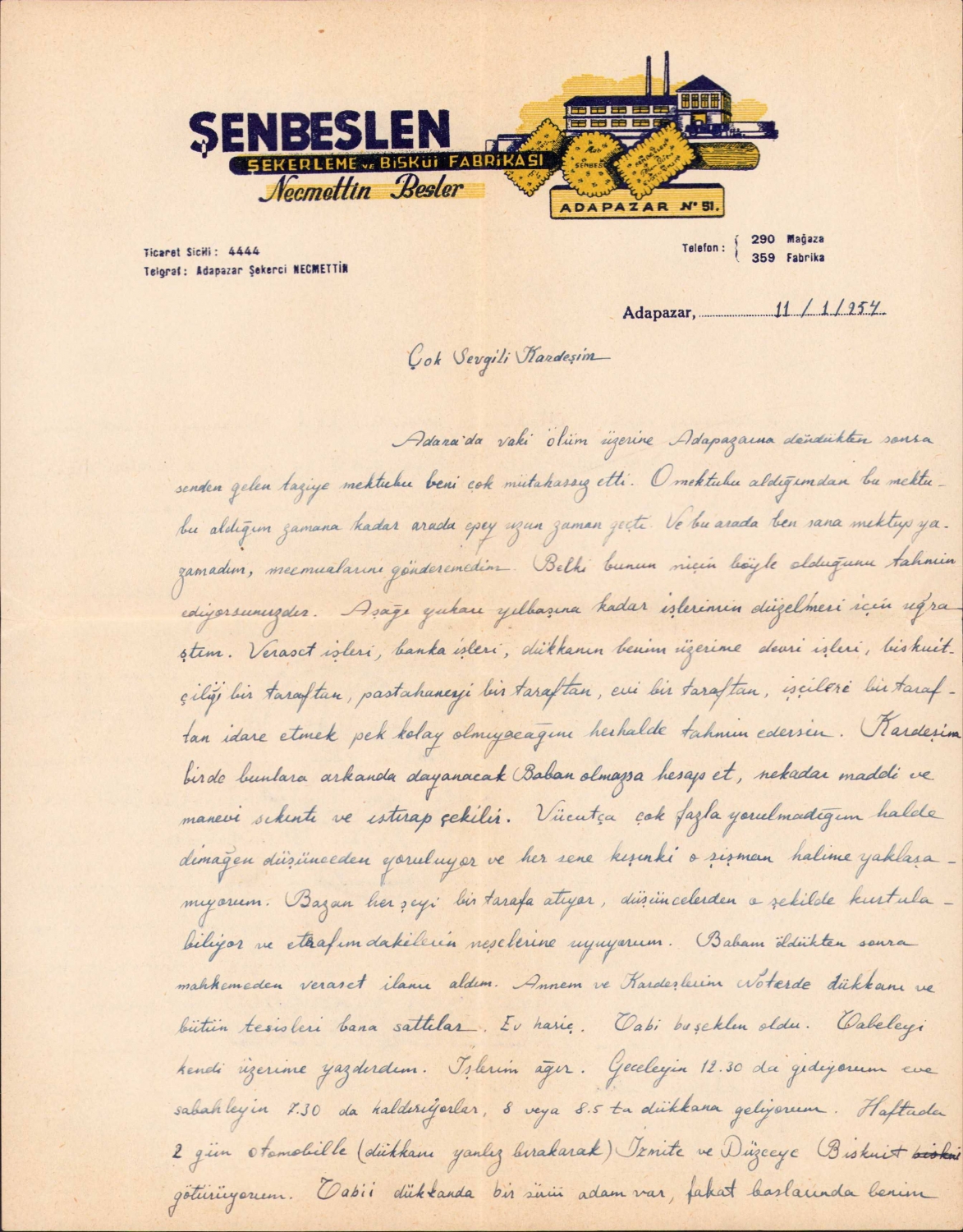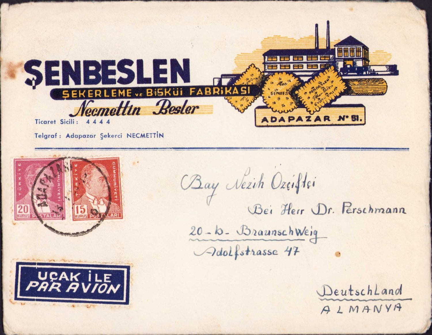 Şenbeslen Şekerleme ve Bisküi Fabrikası - Necmettin Besler, Adapazarı antetli Almanya adresli zarf ve mektup, pullu, damgalı, uçak ile
