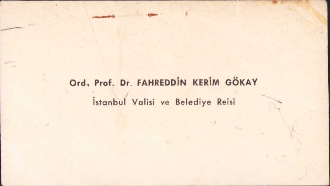 İstanbul Valisi ve Belediye Reisi Fahreddin Kerim Gökay'a ait kartvizit
