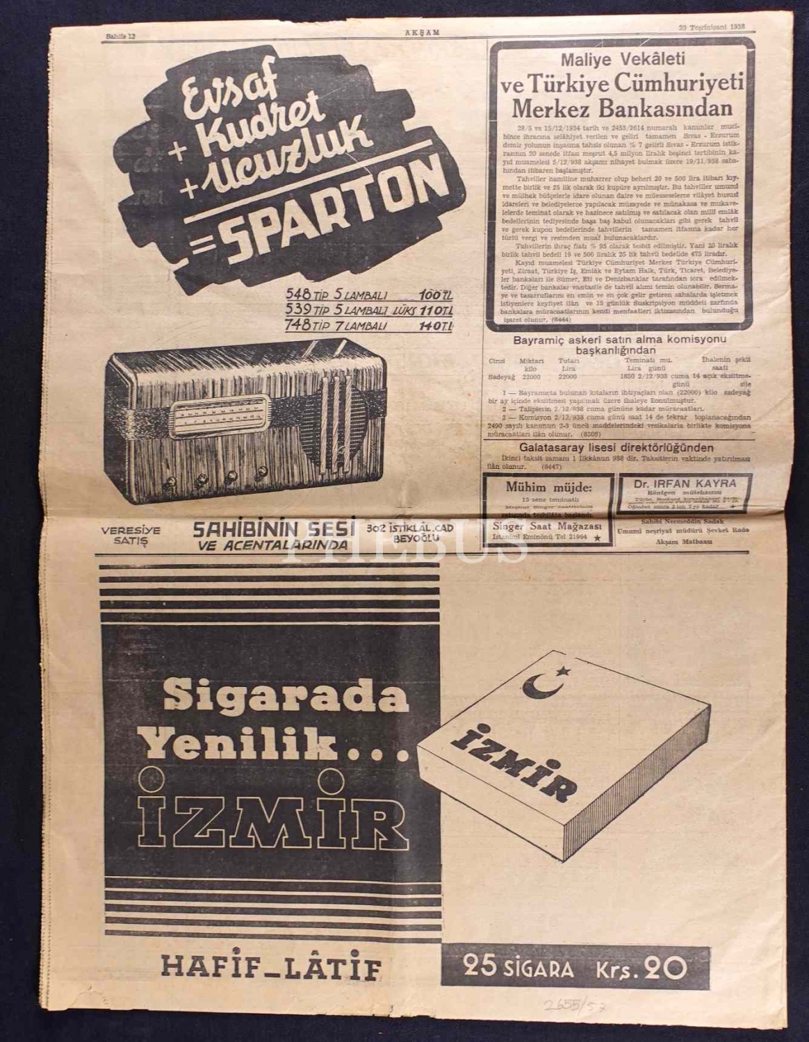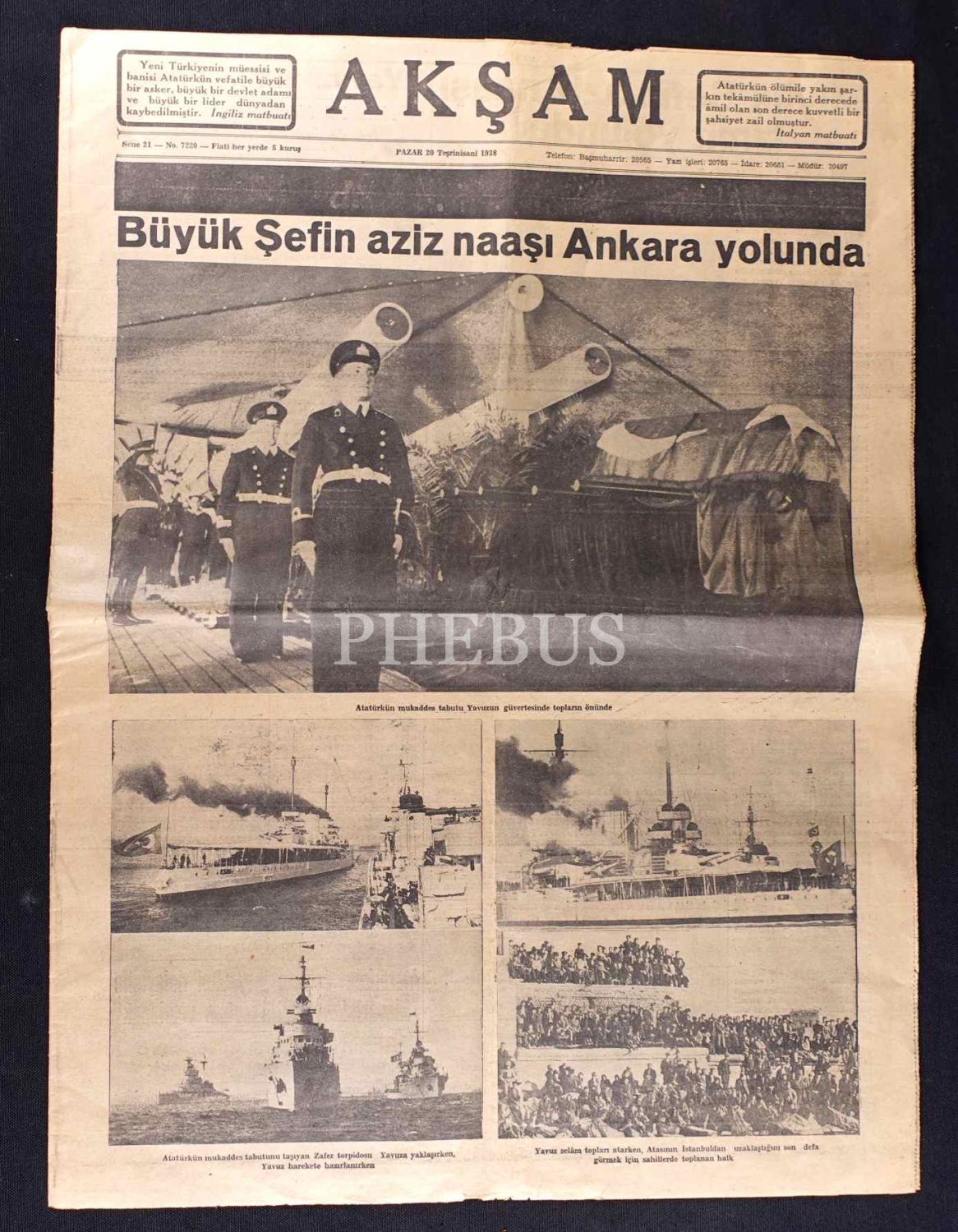 Akşam gazetesinin Atatürk´ün naaşının taşınmasına dair manşet haberiyle 20 Teşrinisani 1938 tarihli sayısı, 40x54 cm