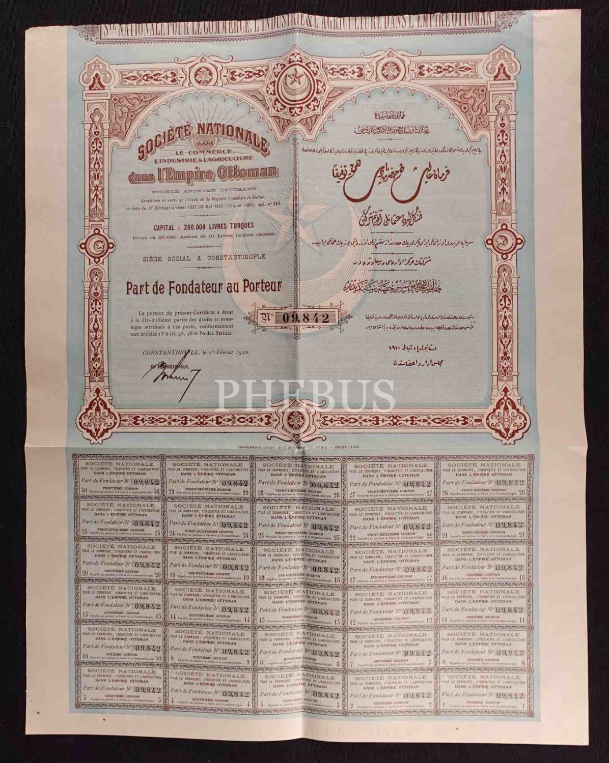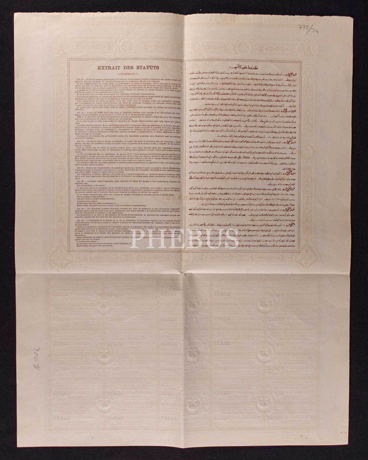 Memalik-i Osmaniyede Ticaret ve Sanayi ve Ziraat Şirket-i Milliyesi´ne ait Osmanlıca-Fransızca hisse senedi, 36x46 cm