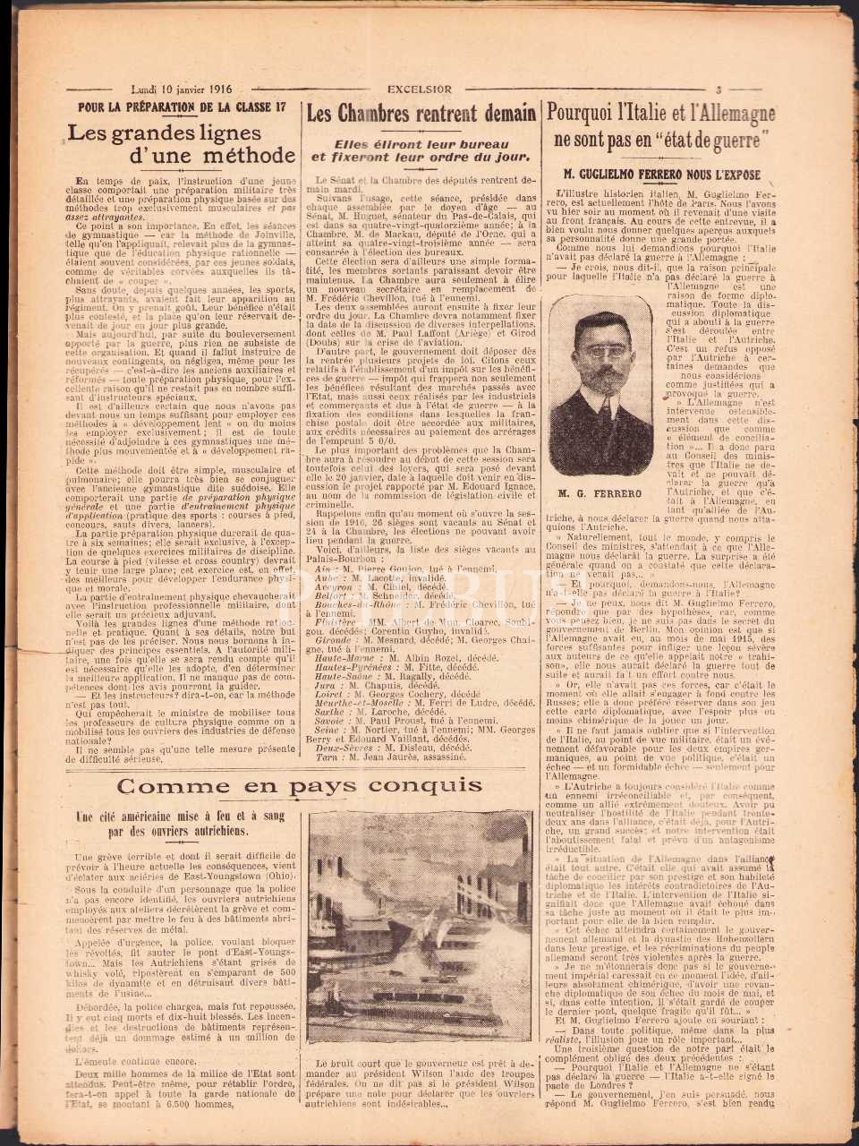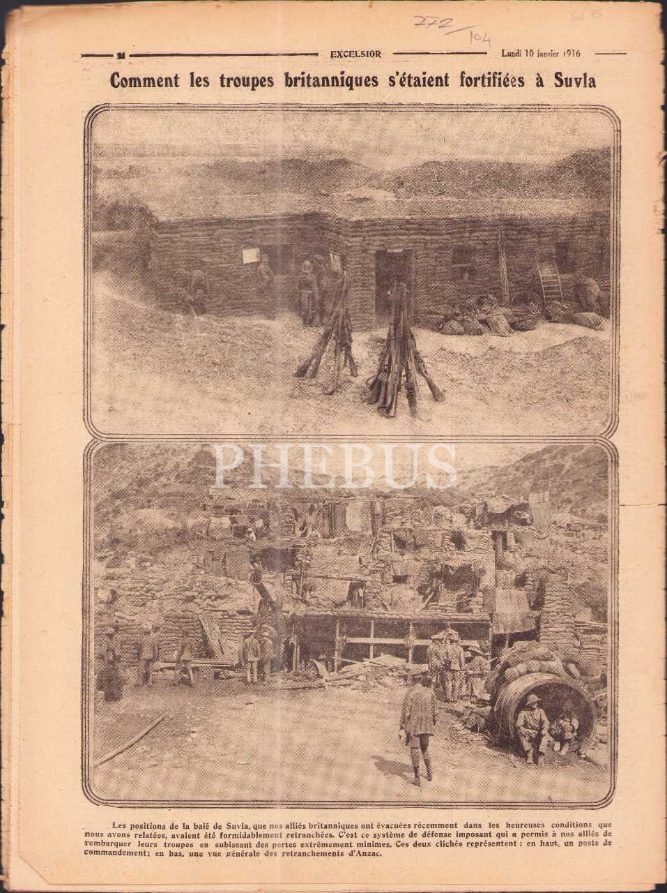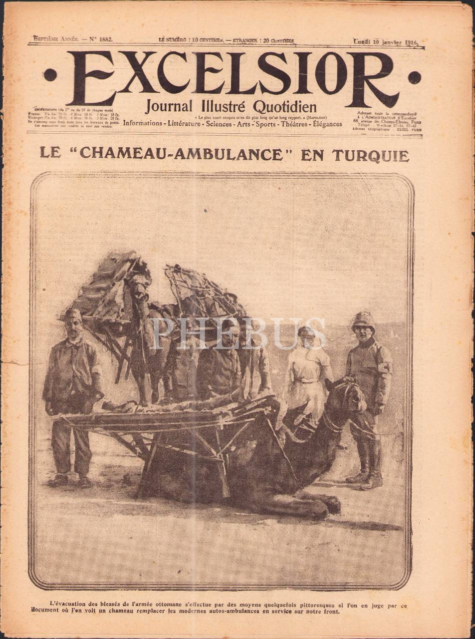Excelsior gazetesinin Osmanlı ordusunun yaralıları tahliye etmesini konu alan kapak görseliyle 10 Ocak 1916 tarihli sayısı, 28x37 cm