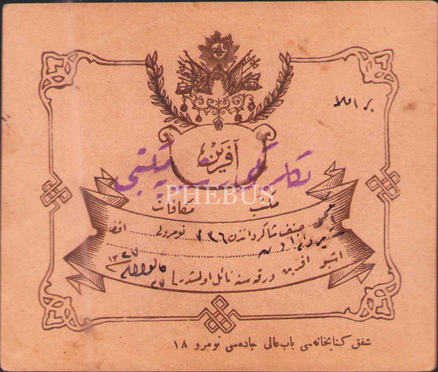 Eğitim tarihi: Beylerbeyi Rüşdiye Mektebi´nden imla dersi için 1327 tarihli aferin kâğıdı, 10x12 cm