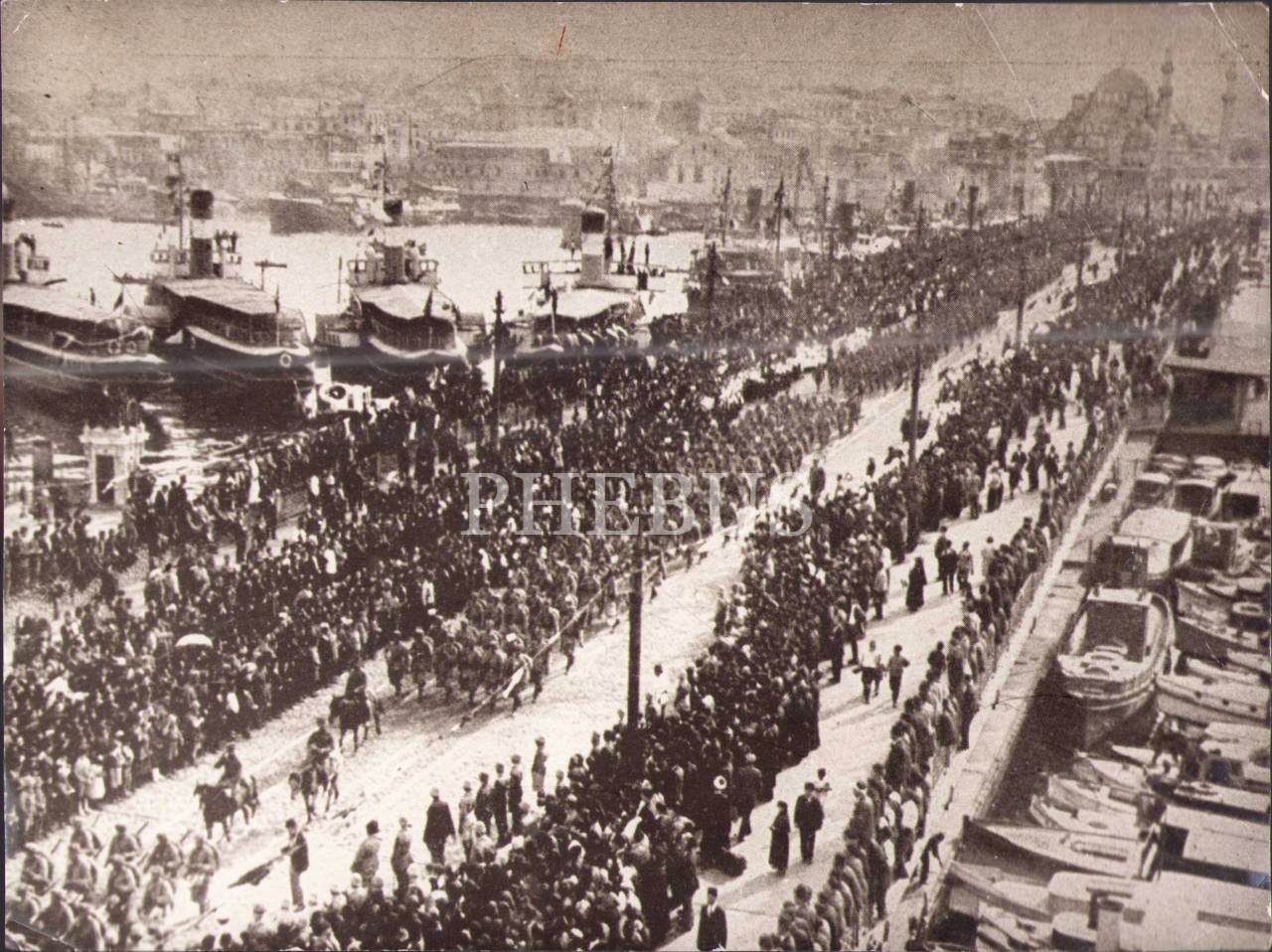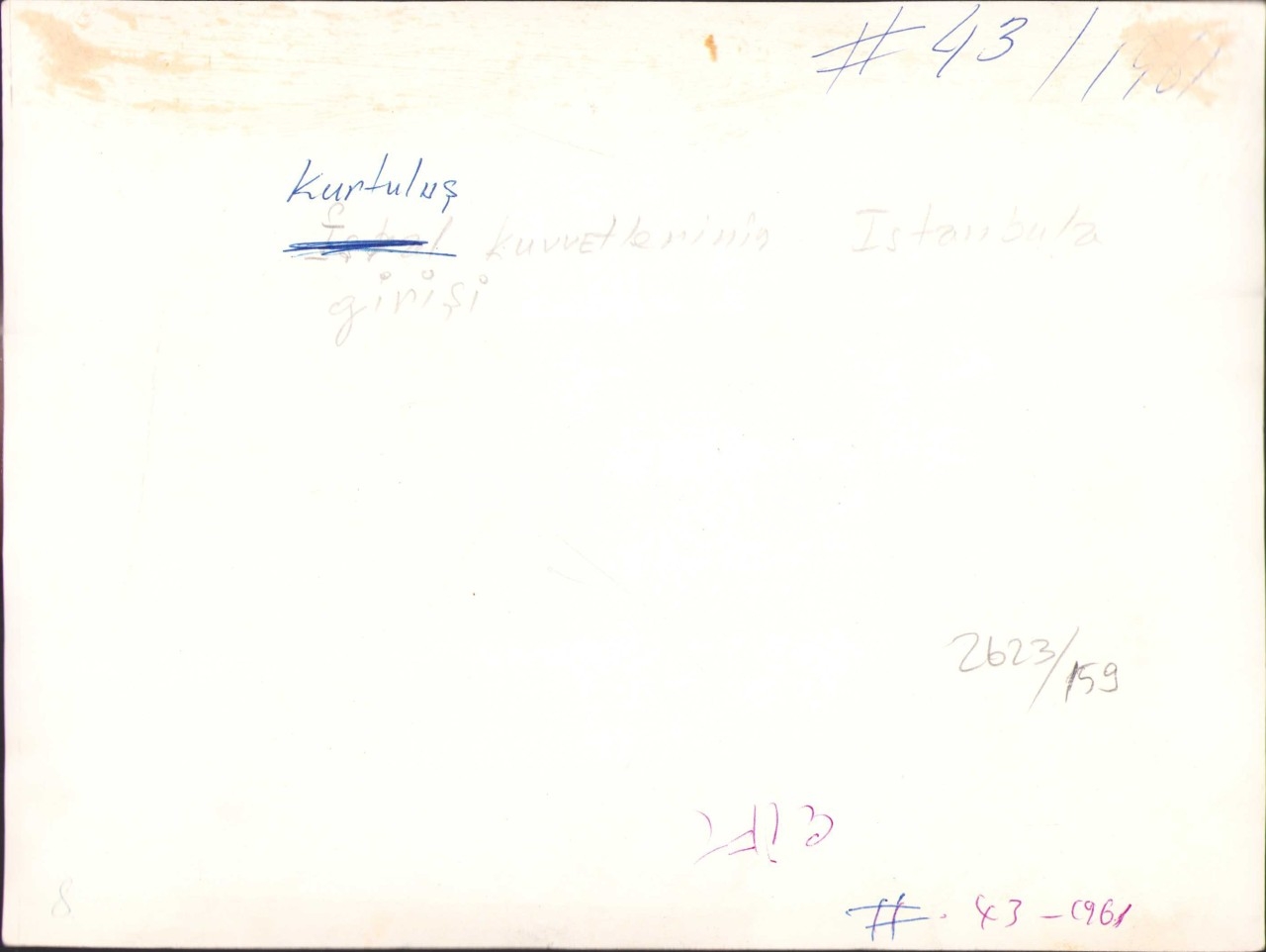 Kurtuluş kuvvetlerinin İstanbul´a girişi [baskı], 18x24 cm, üst köşesi kırık haliyle