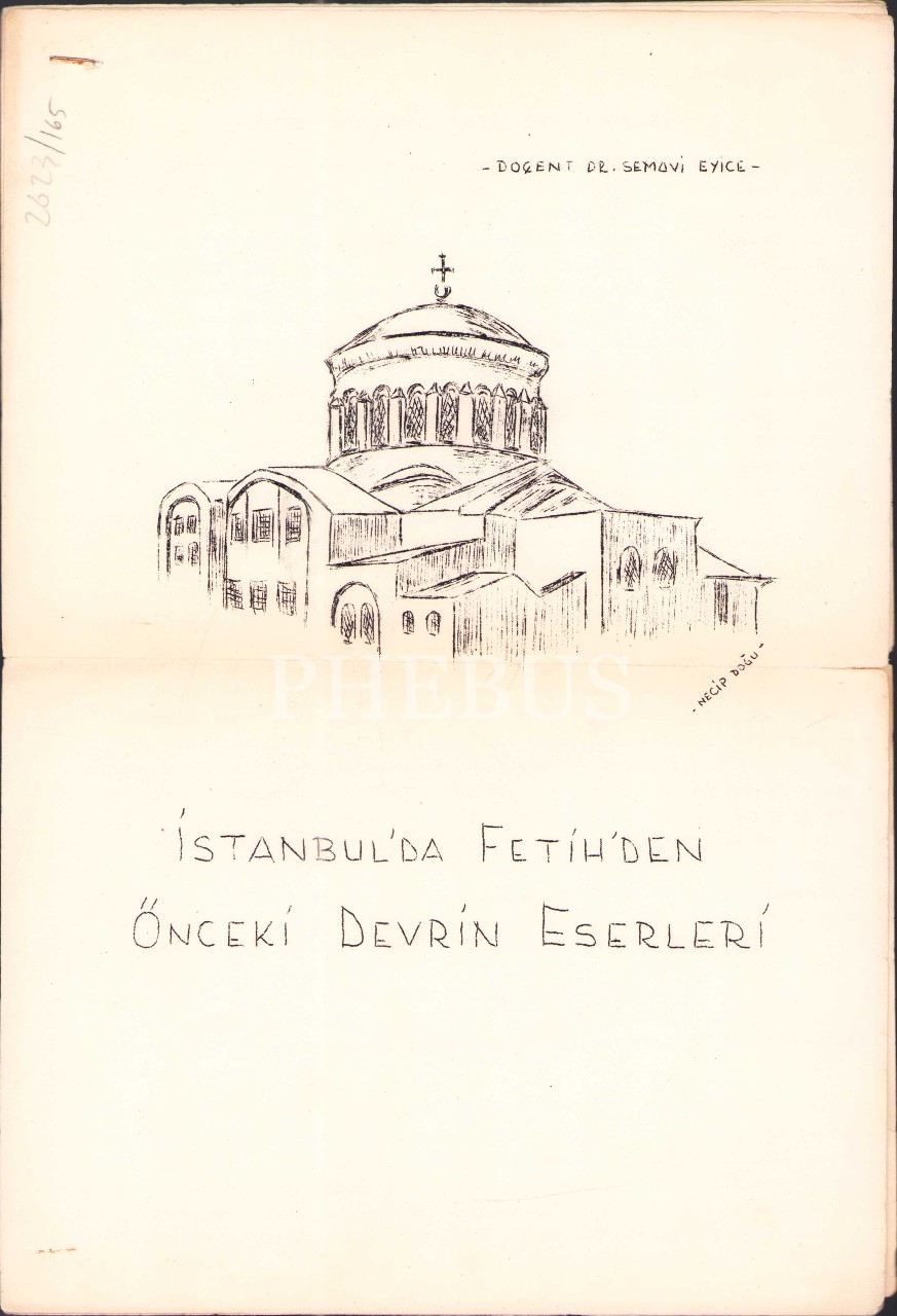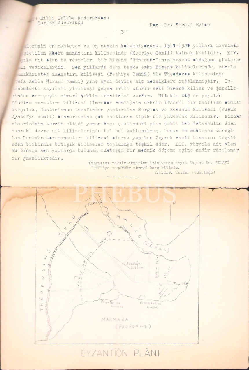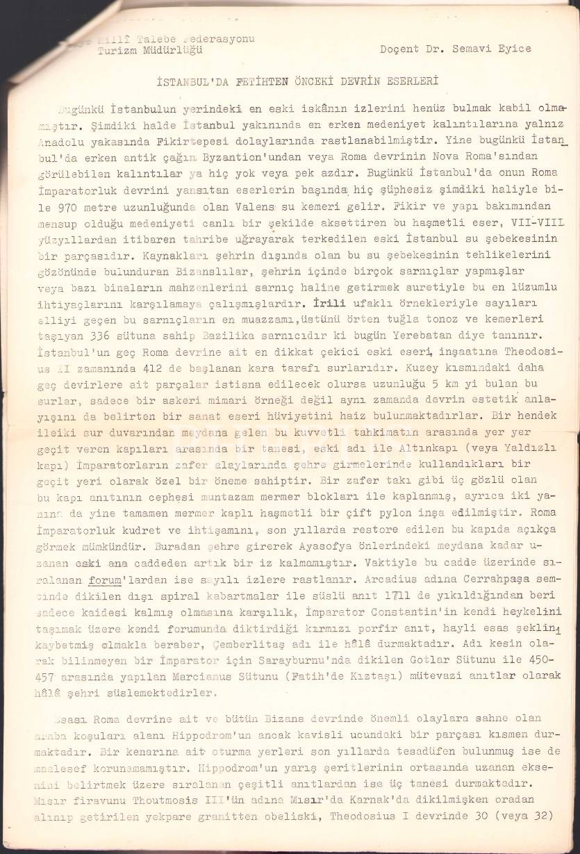 Semavi Eyice tarafından yazılan "İstanbul´da Fetih´den Önceki Devrin Eserleri" (3 sayfalık baskı metin), Türkiye Millî Talebe Federasyonu Turizm Müdürlüğü, 22x33 cm