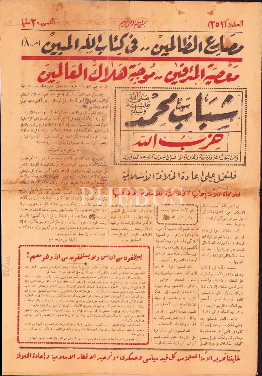 Arapça Şebâbü Seyyidina Muhammed [Efendimiz Muhammed´in Gençleri] gazetesinin 251. sayısı, 29x41 cm, kapak sayfası yırtık haliyle