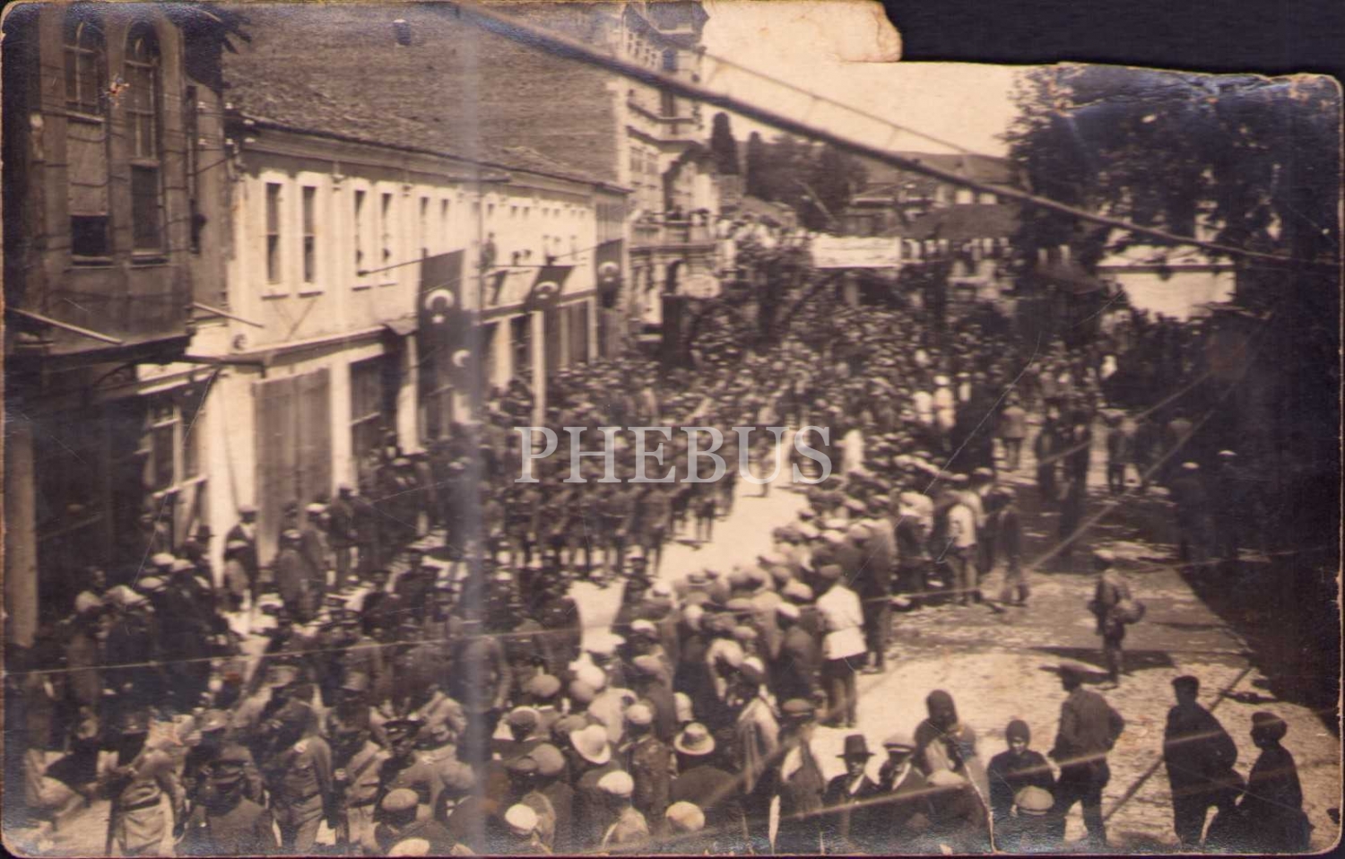 Osmanlıca yazılı takın yer aldığı kutlamada askerlerin geçişini izleyen halk