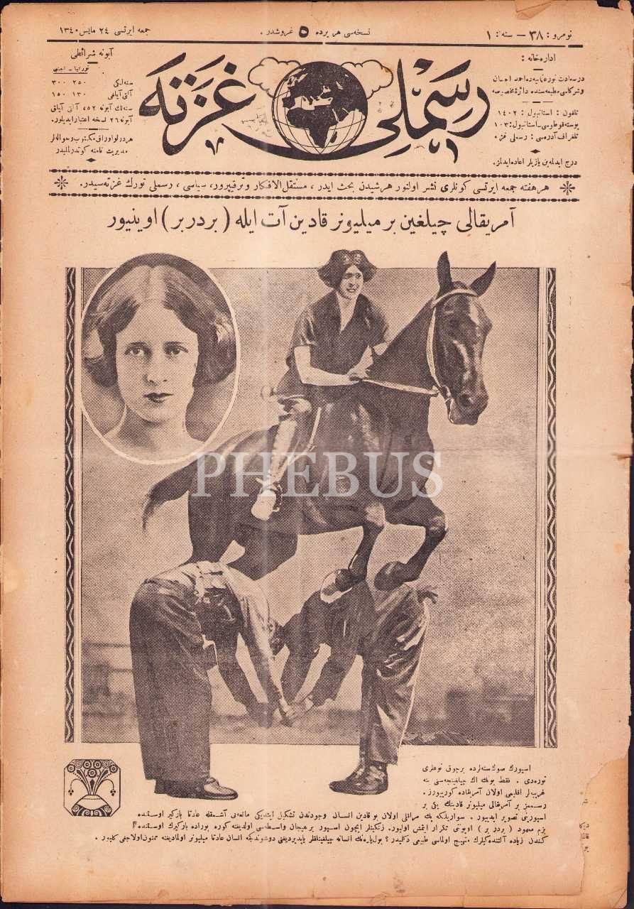 Resimli Gazete´nin 24 Mayıs 1340 tarihli sayısı, "Amerikalı çılgın bir milyoner kadın at ile Birdirbir oynuyor" başlıklı kapak görseliyle, 28x39 cm