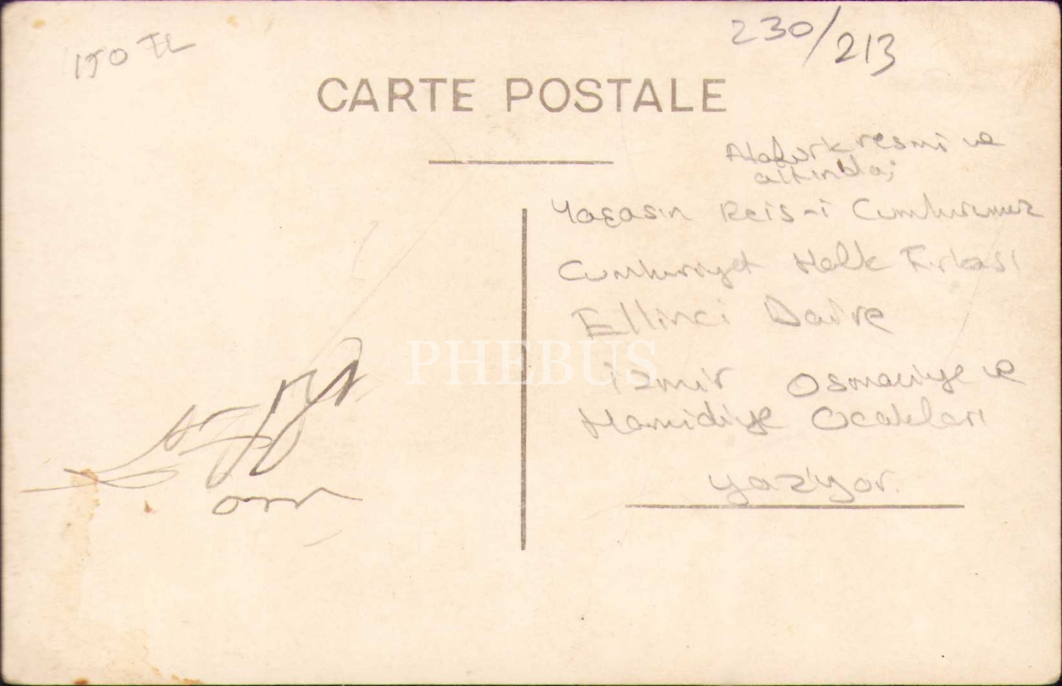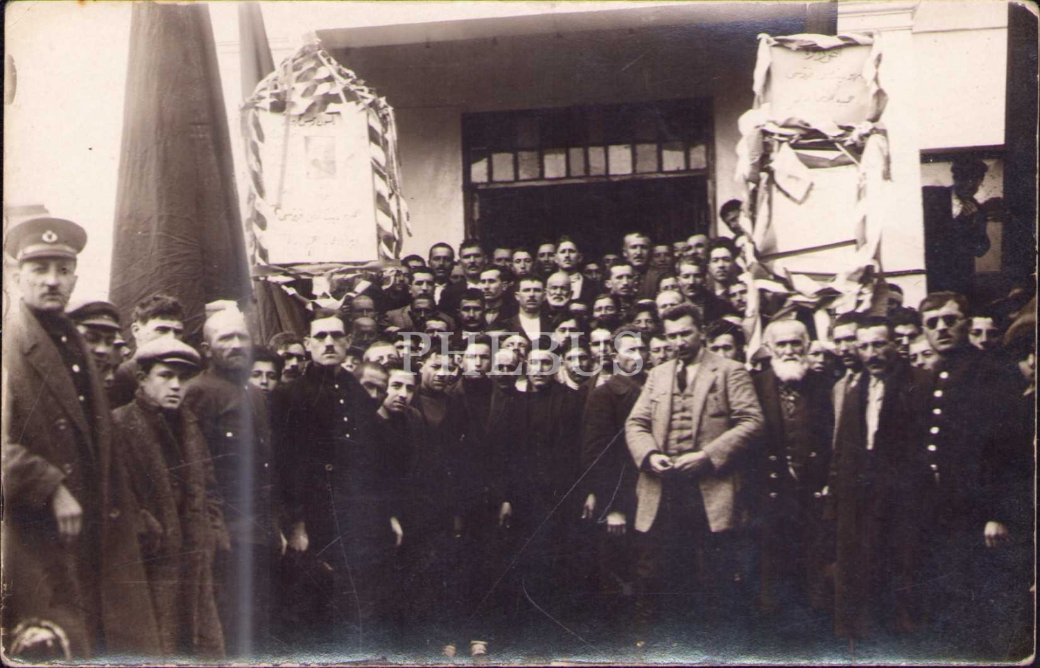 "Yaşasın Reis-i Cumhurumuz- Cumhuriyet Halk Fırkası" yazısı önünde topluluk hatıra fotoğrafı