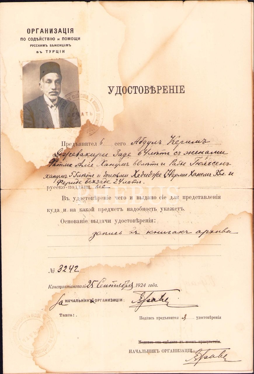 Türkiye´de Rus Mültecileri Yardım ve Destek Teşkilâtı antetli ve fotoğraflı Rusça-Osmanlıca-Fransızca şehadetname, İstanbul 1924, 22x33 cm, kenarı yırtık haliyle