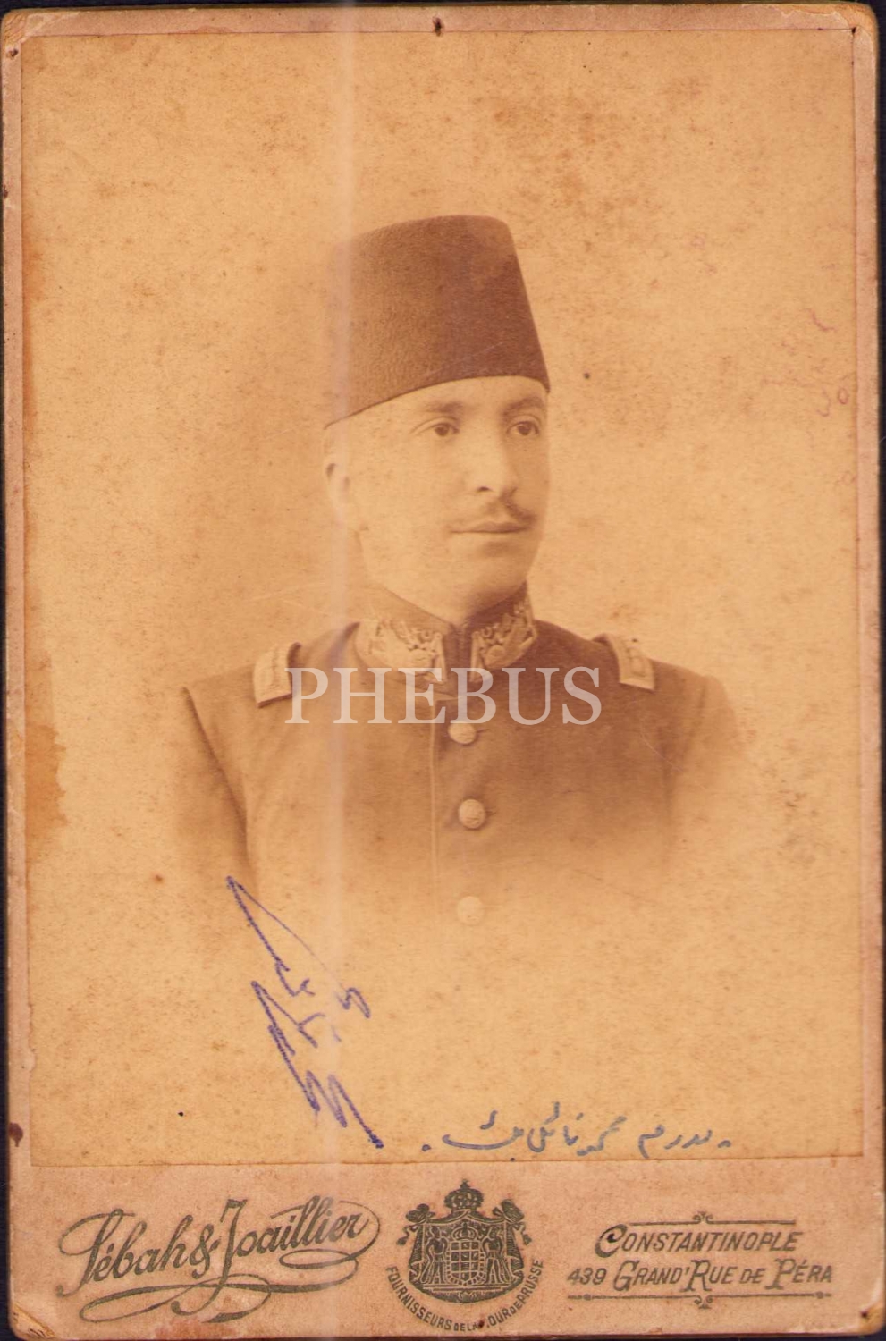 Kalpaklı Osmanlı subayının kabin fotoğrafı, Sebah&Joaillier Fotoğrafhanesi/Constantinople, 11x16 cm