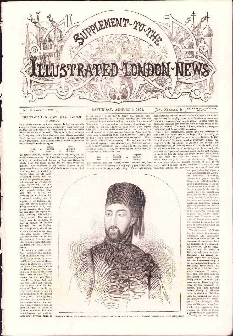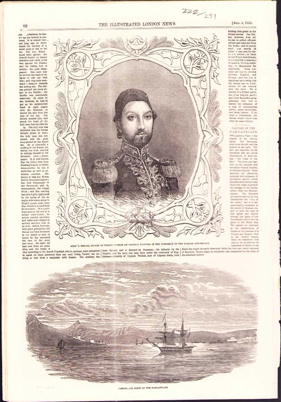 Illustrated London News dergisinin Sultan Abdülmecid, Reşid Paşa ve İstanbul gravürlerini içeren 6 Ağustos 1853 tarihli sayısı, 27x40 cm