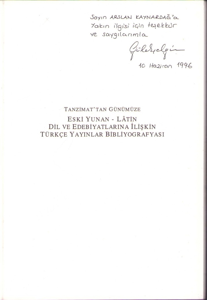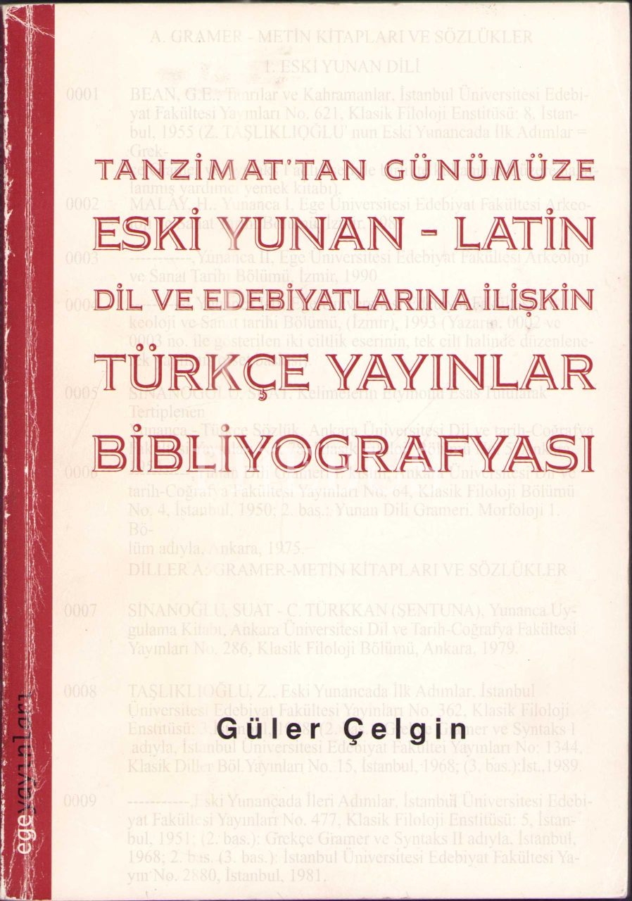 TANZİMAT´TAN GÜNÜMÜZE ESKİ YUNAN-LATİN DİL VE EDEBİYATLARINA İLİŞKİN TÜRKÇE YAYINLAR BİBLİYOGRAFYASI, Güler Çelgin, yazarından ithaflı ve imzalı, Ege Yayınları, 160 s., 15x21 cm