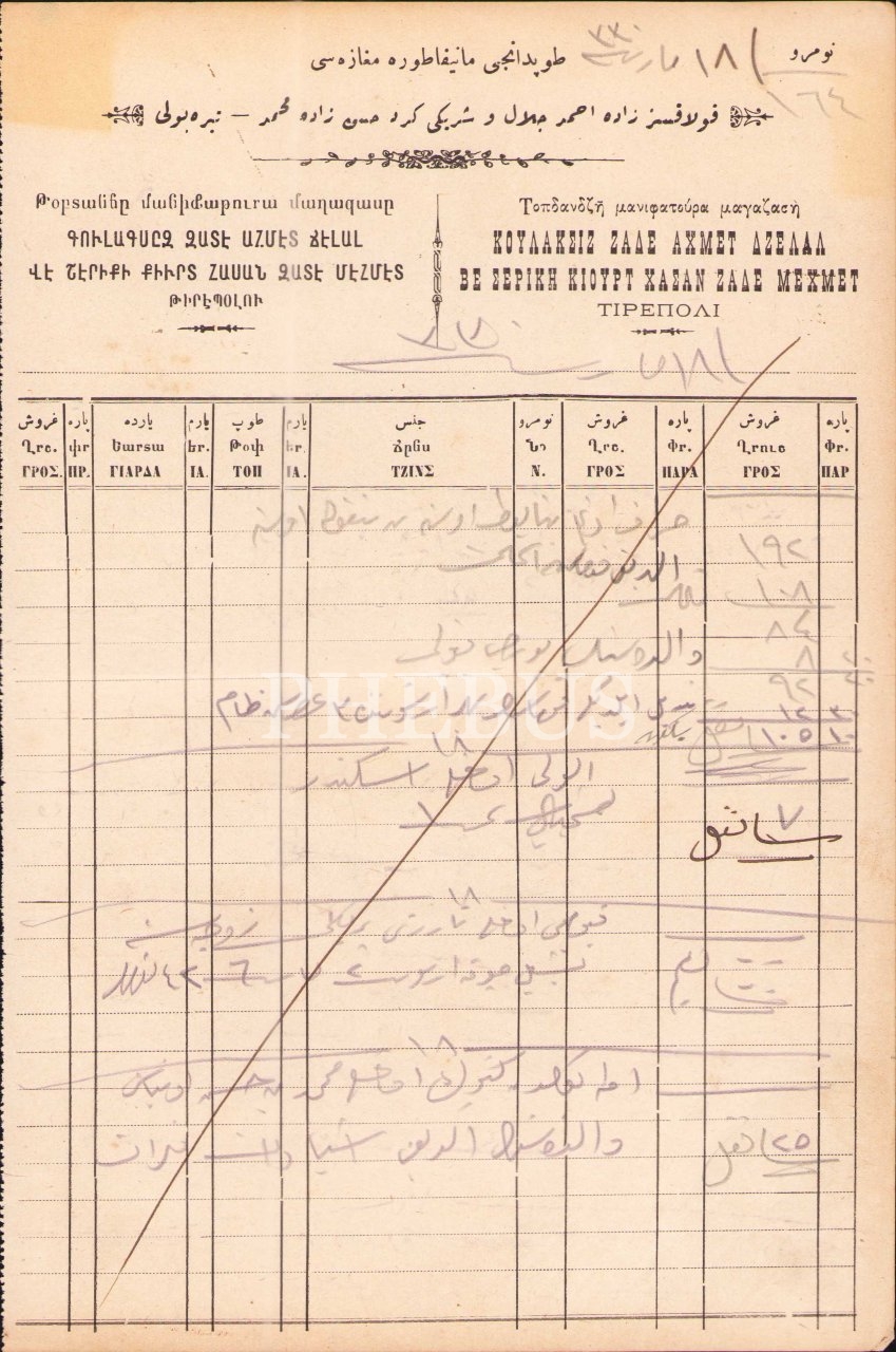 Karamanlıca ve Osmanlı Türkçesi ile Ermeni harfli Türkçe olmak üzere 3 alfabeli manifaturacı faturası, Tirebolu/Giresun 1330, 18x27 cm